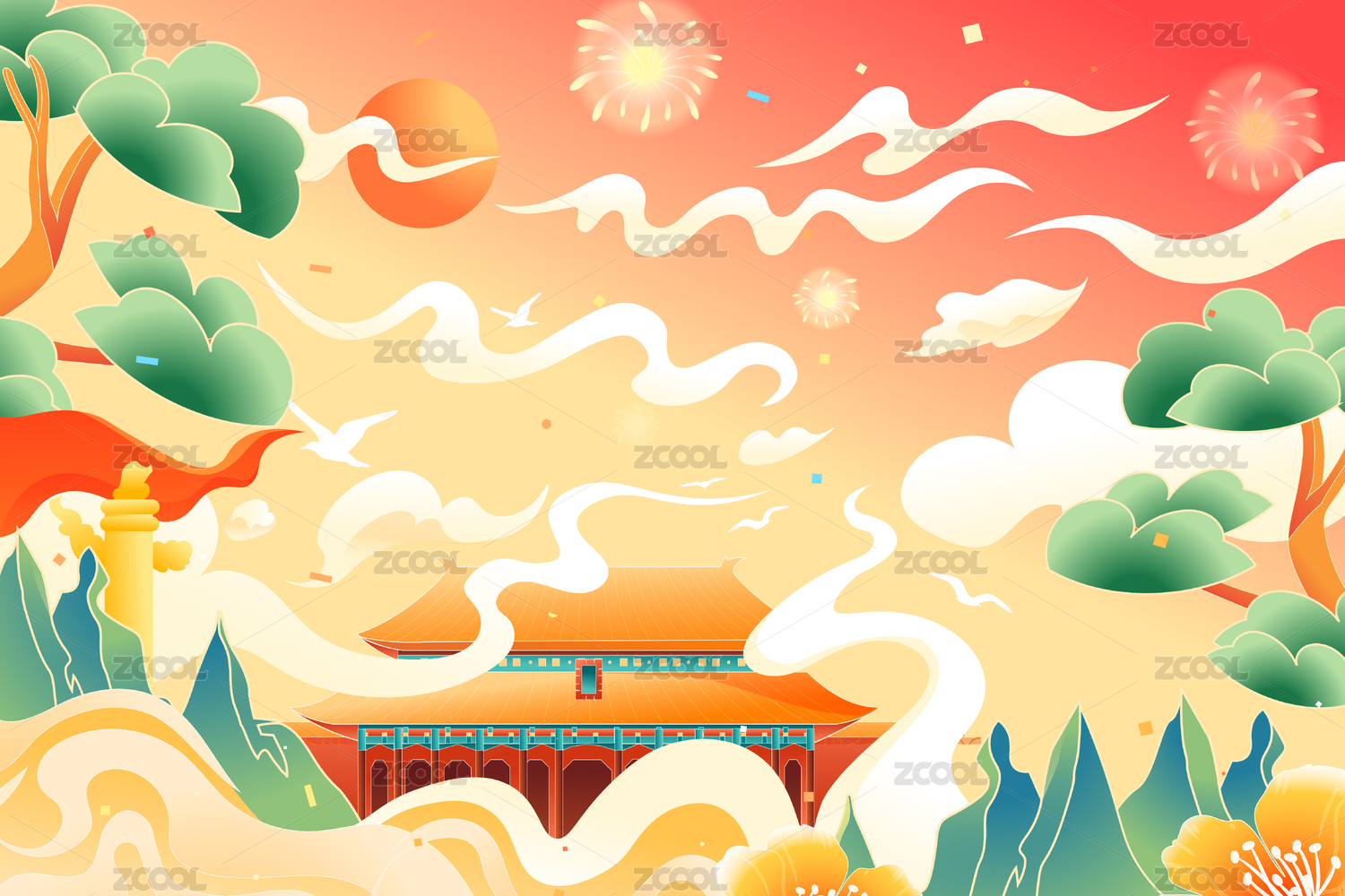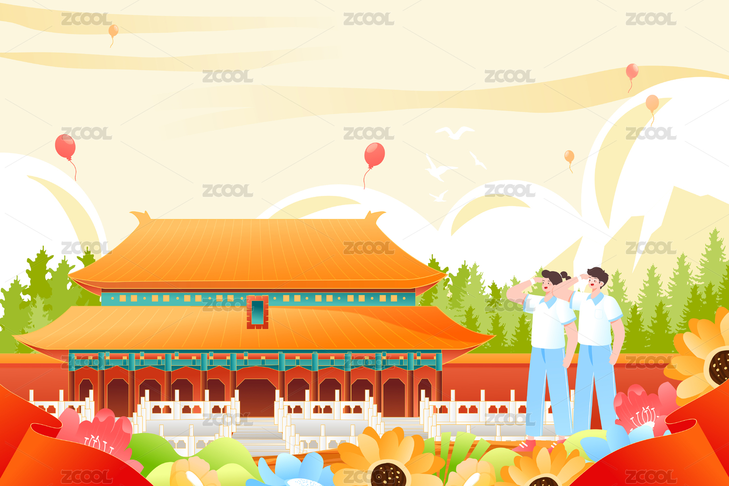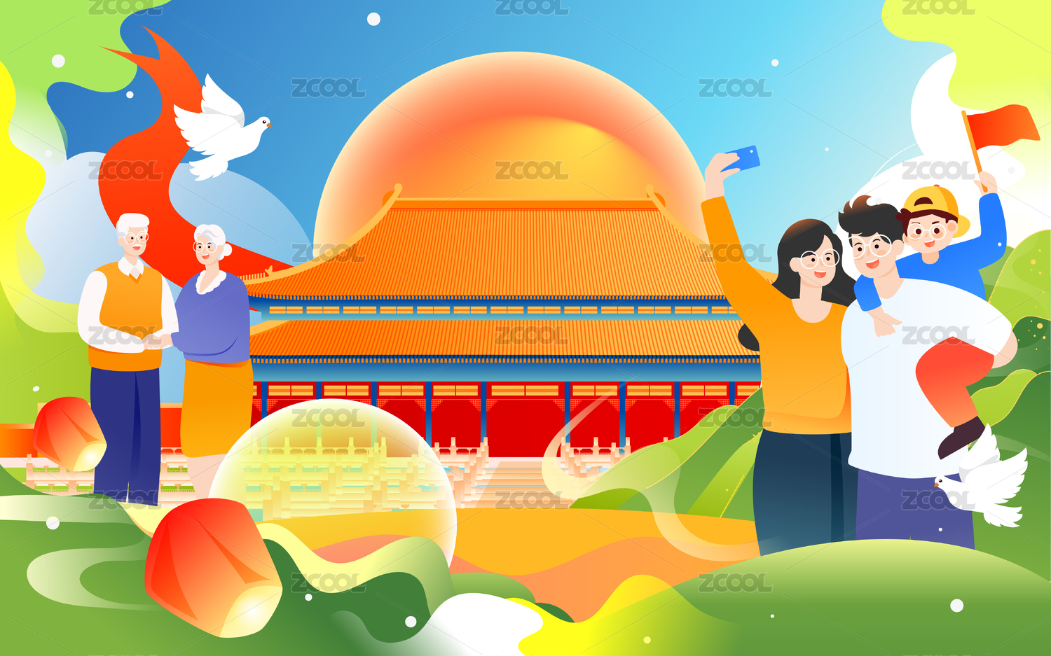 国庆节一家人出门景点旅游地标建筑国潮插画