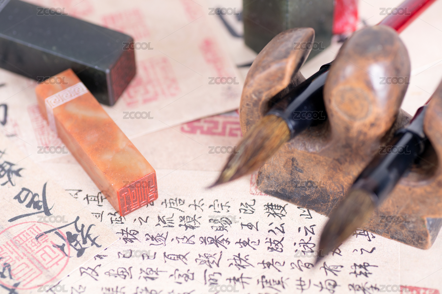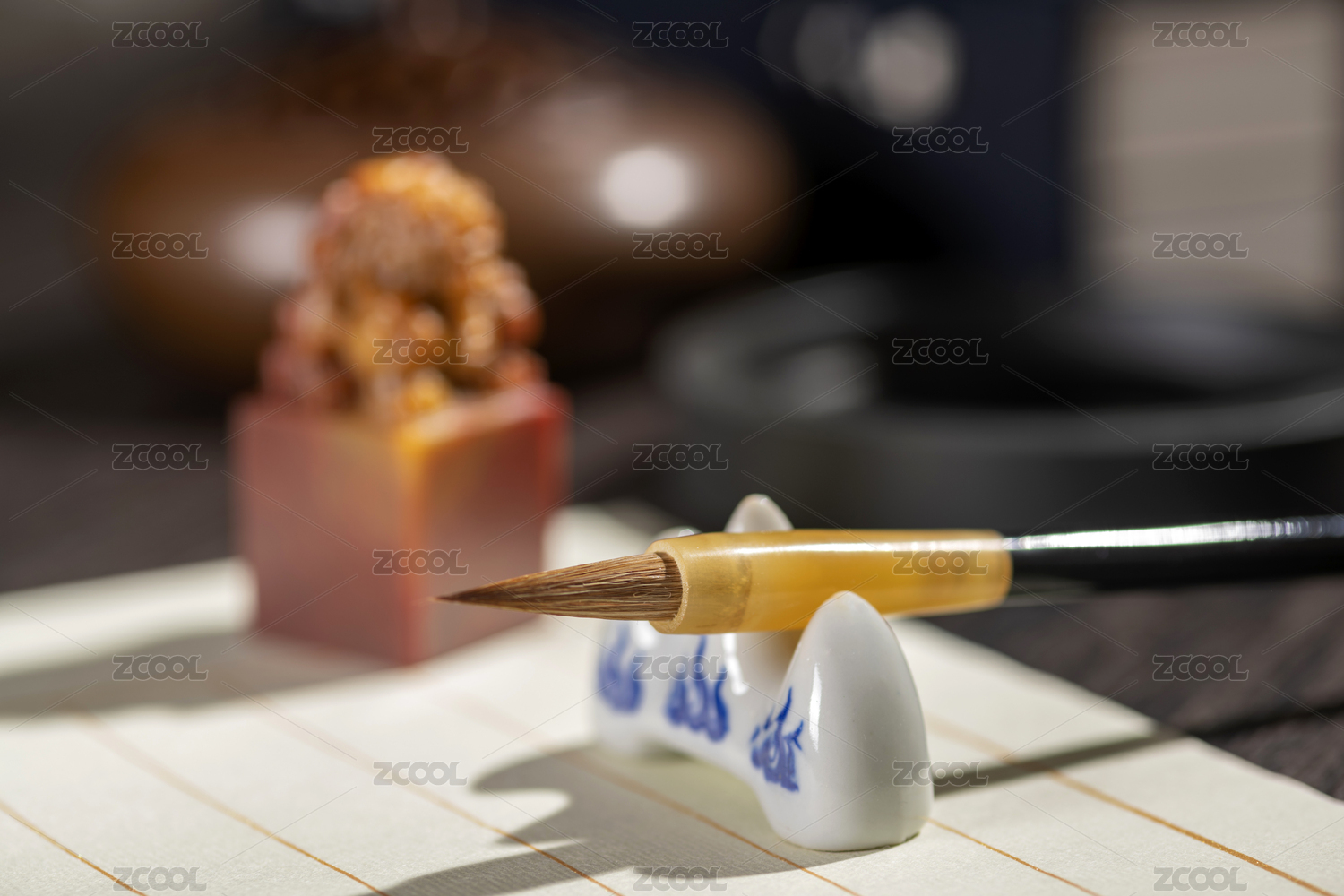 桌面上的毛笔宣纸砚台印章等文房四宝