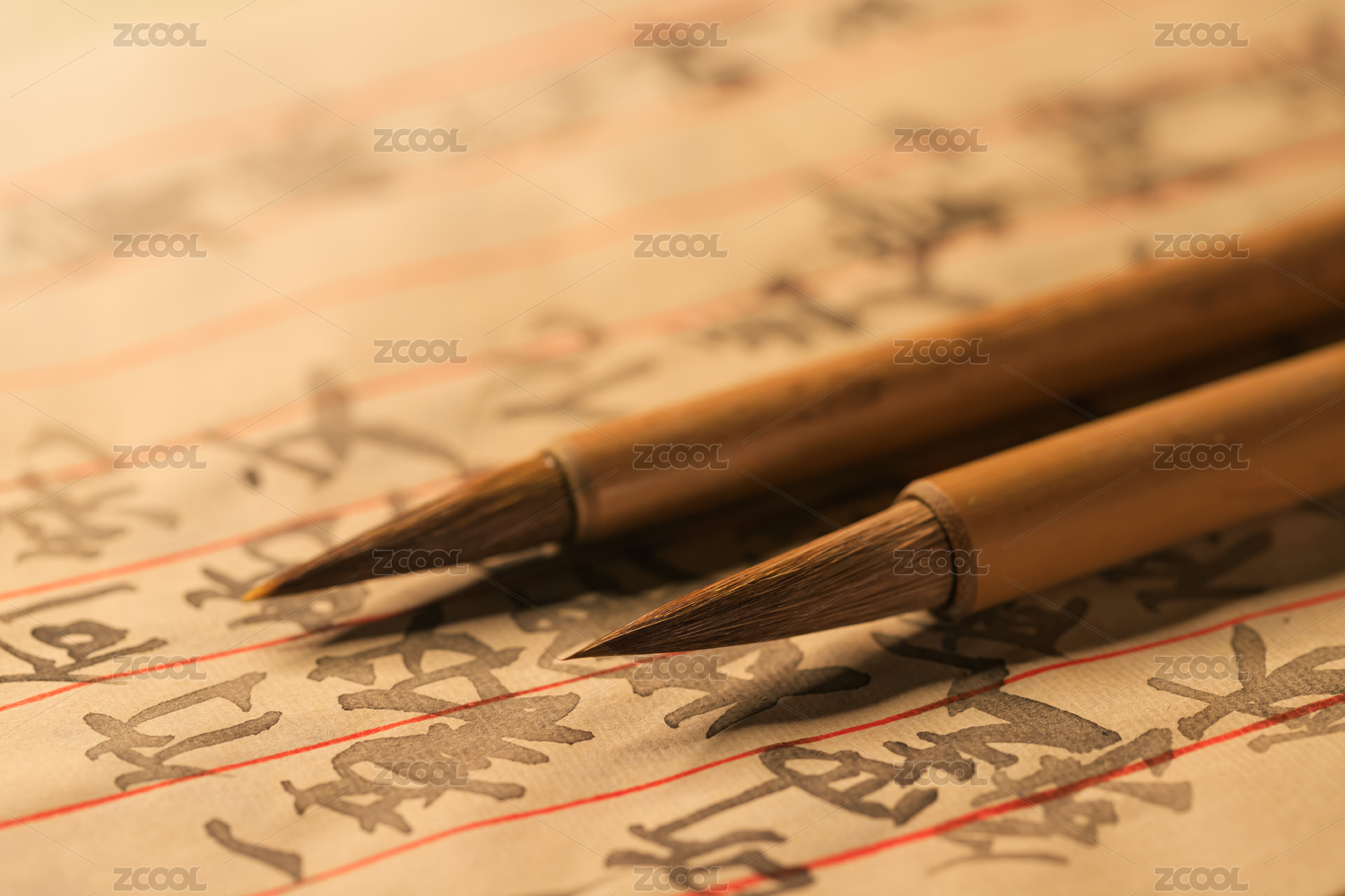 书桌上中国毛笔特写书法工具