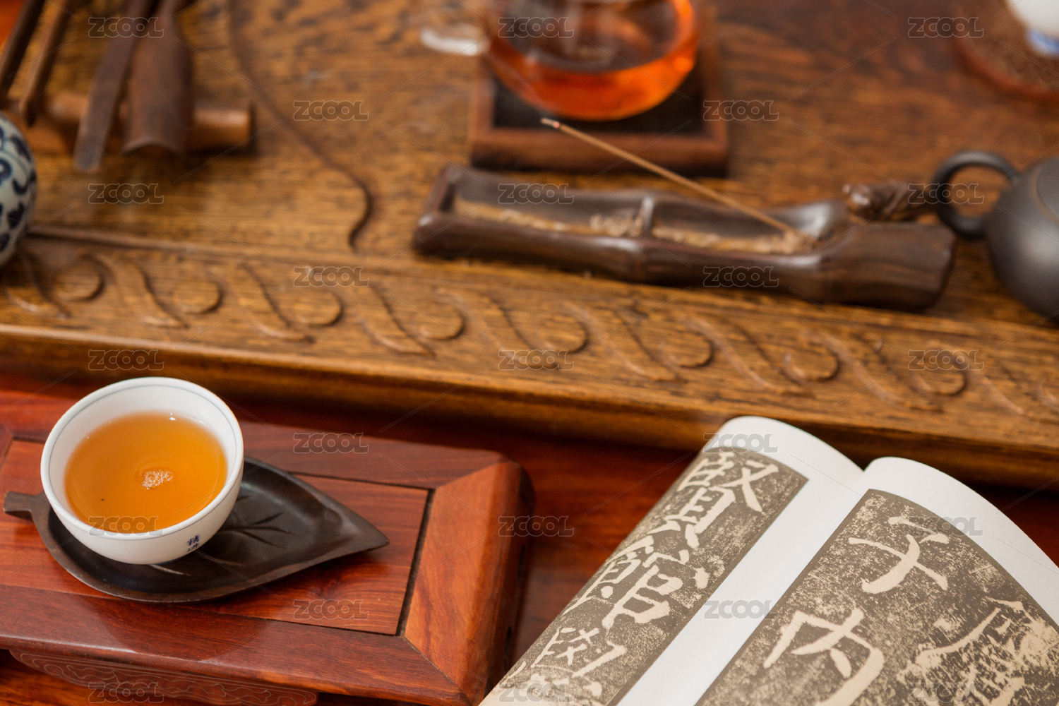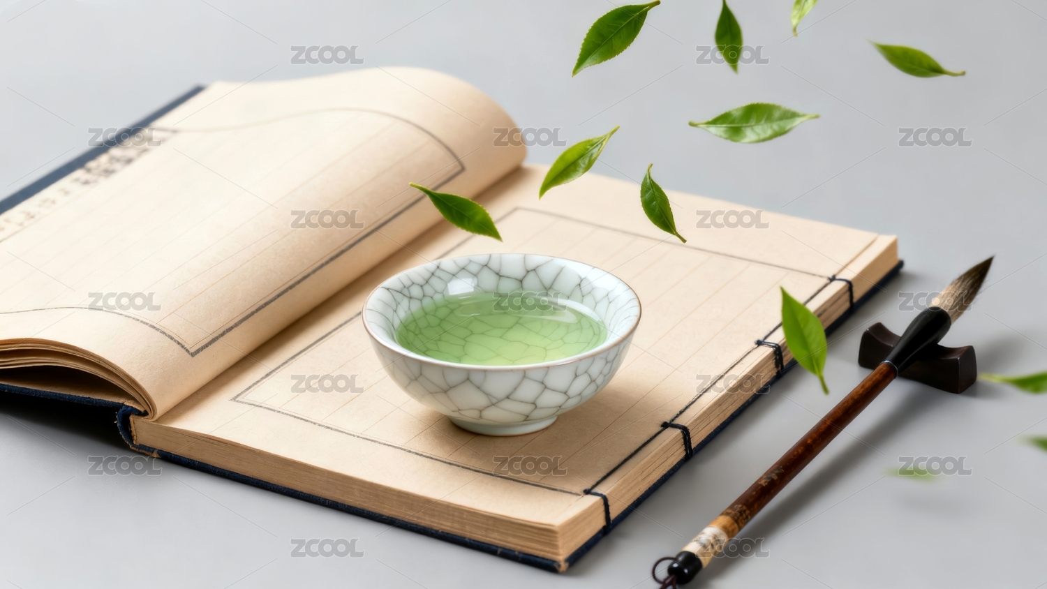 俯视桌子上的古旧书籍和毛笔及放在书上的一碗茶