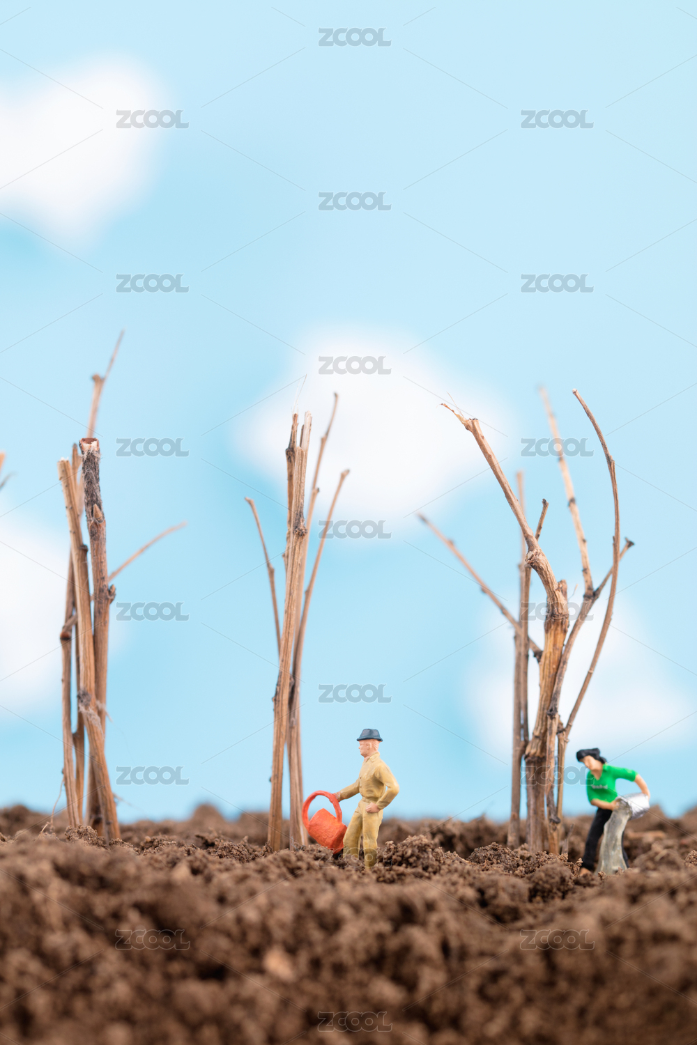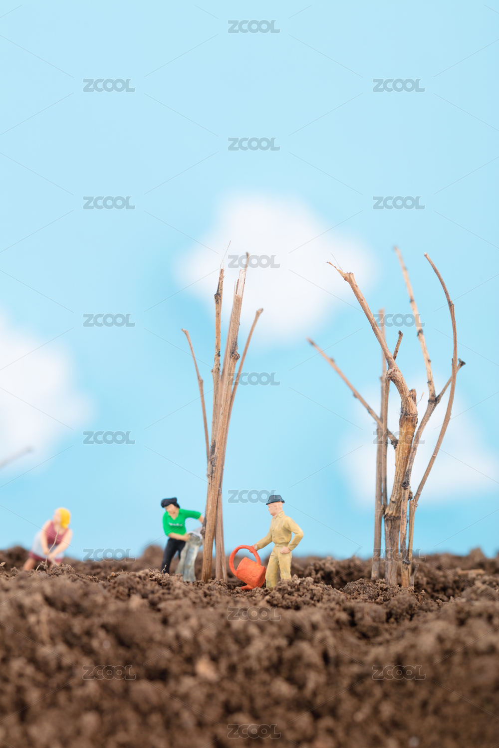 微缩世界人偶正为种好的树浇水