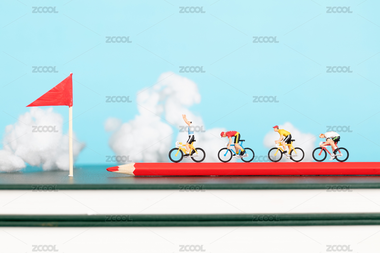 一群骑赛车的微缩模型行驶在彩铅笔上铅笔在