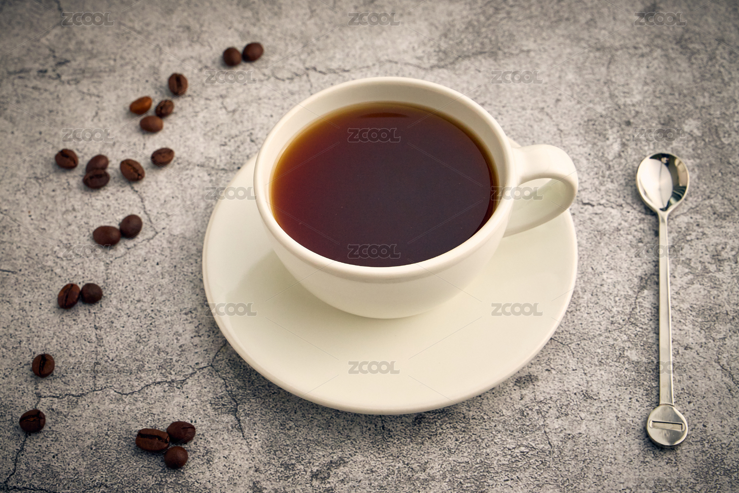 一杯咖啡和咖啡豆摆放在桌面上特写