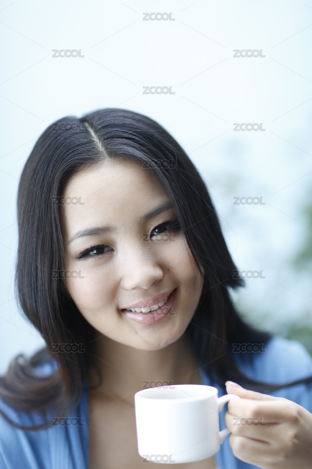 亚洲健康微笑女孩喝喝茶看看窗外,健康食品概念