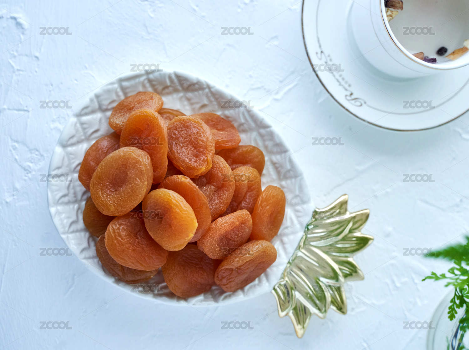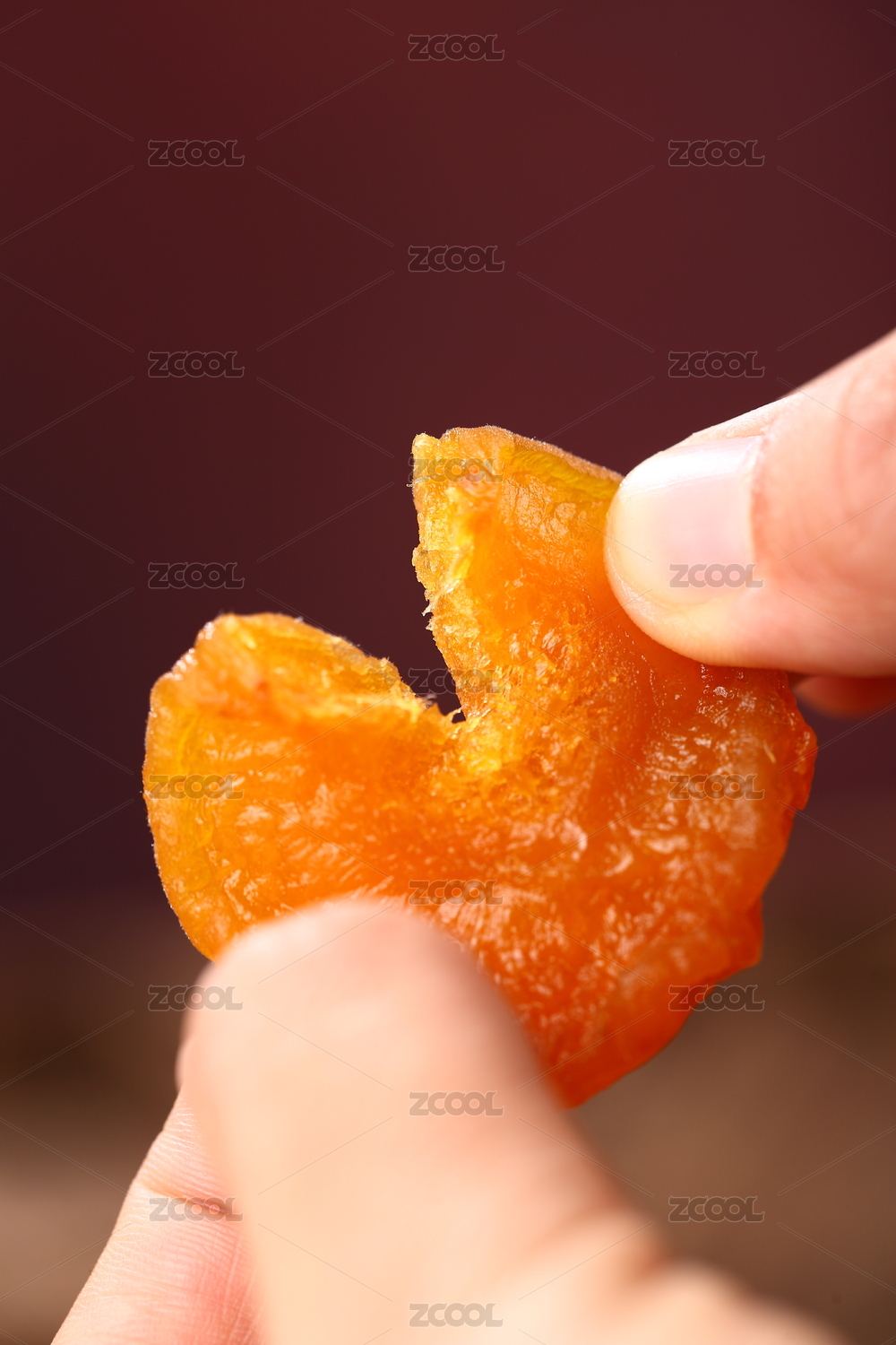中国的,食品的,美食,剥开的,手握,黄色的,白色背景,绿植背景,木盘,杏干