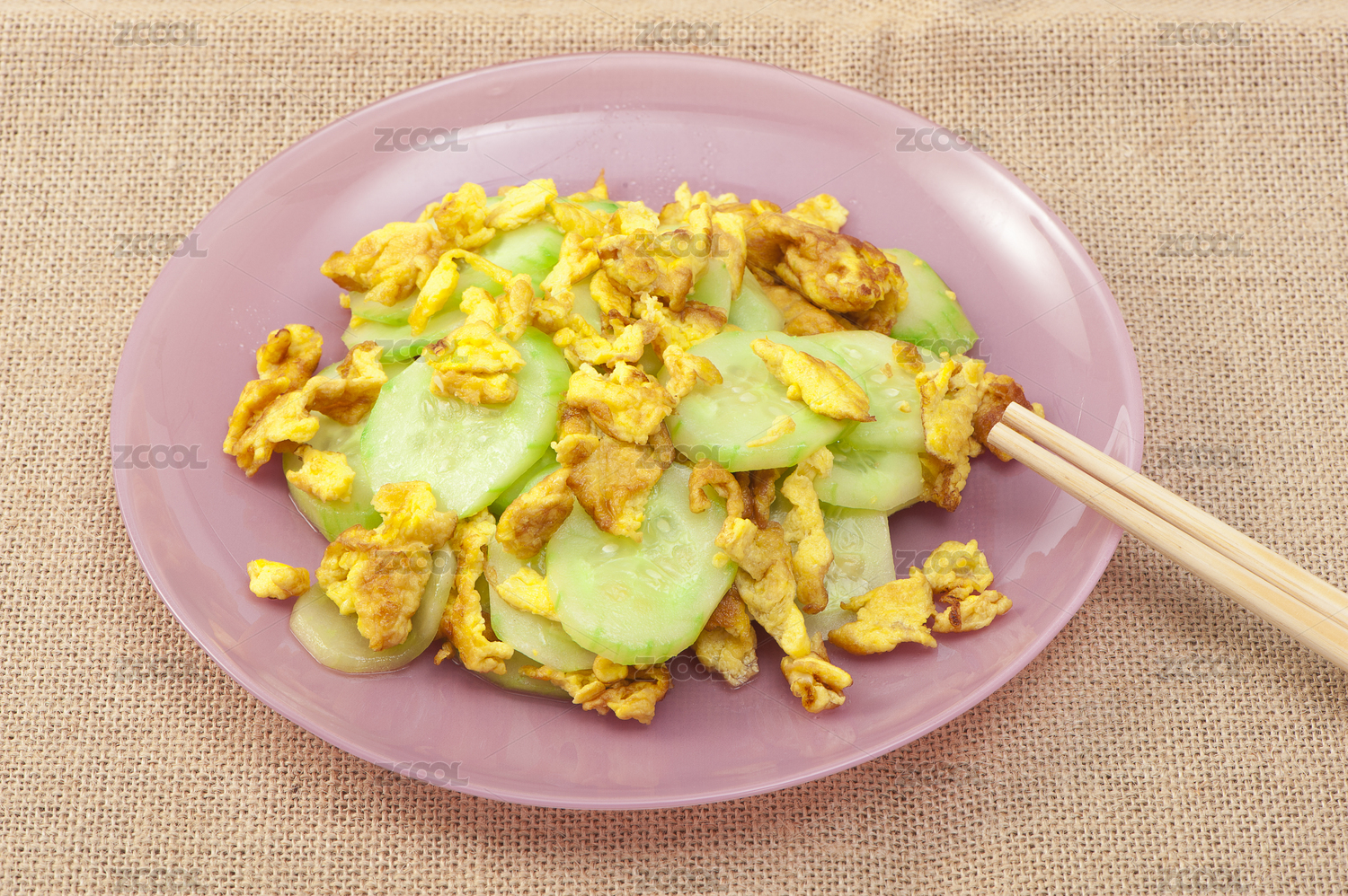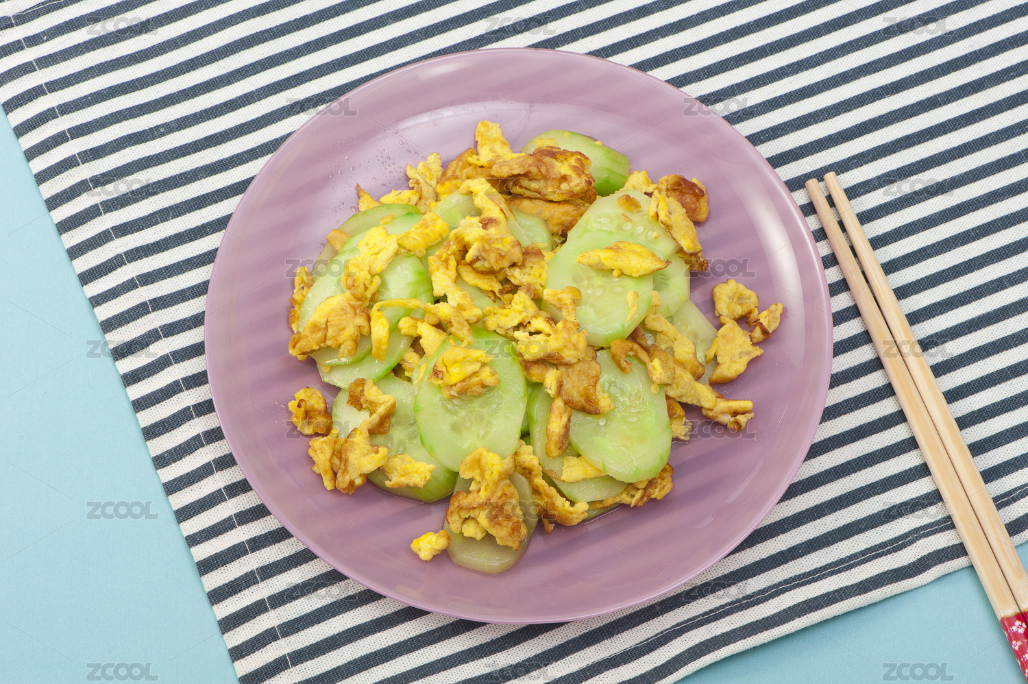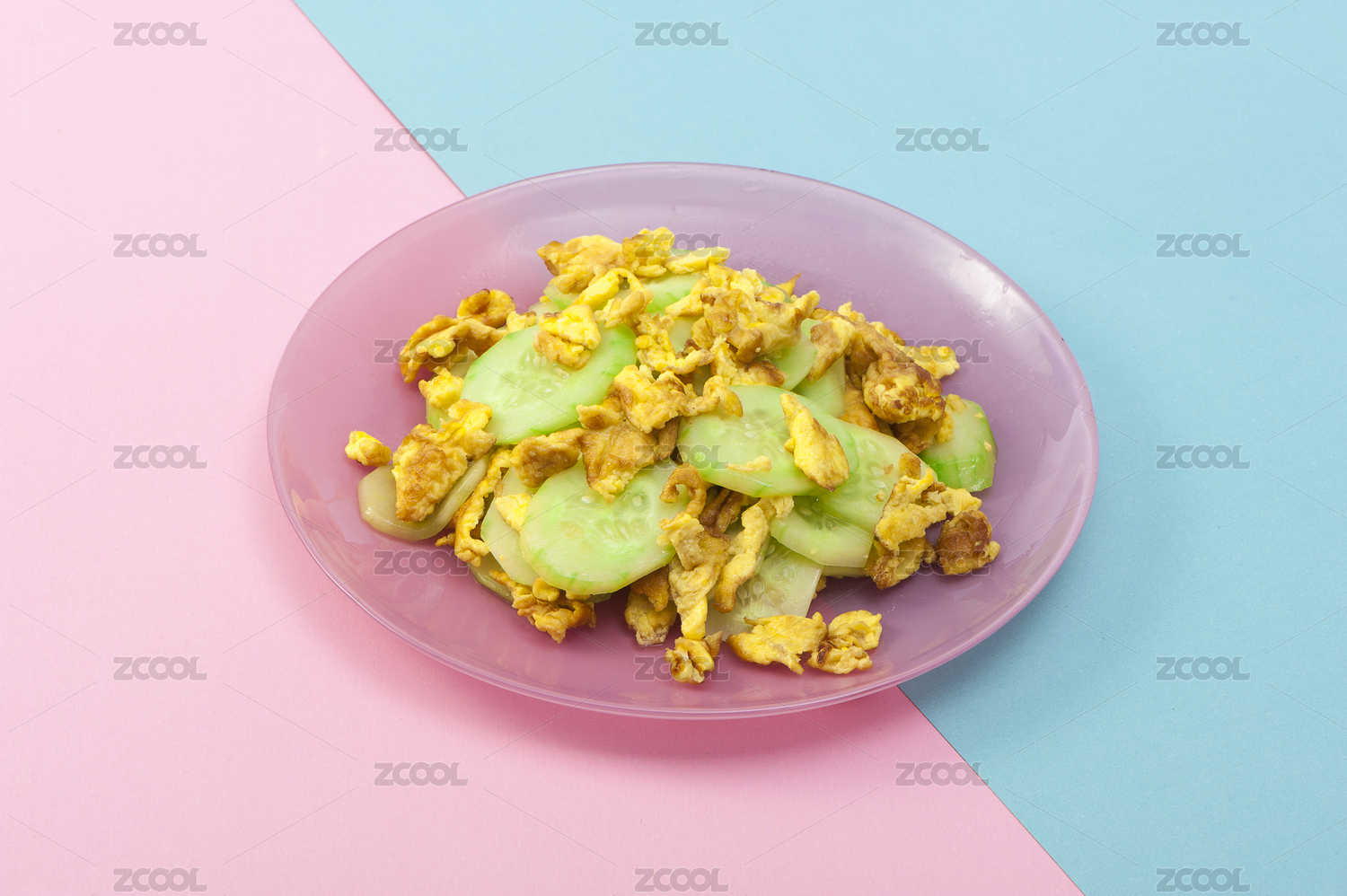 美食,蛋白质,室内,特写,白底,白背景,黄瓜片,热菜,炒鸡蛋,蔬菜
