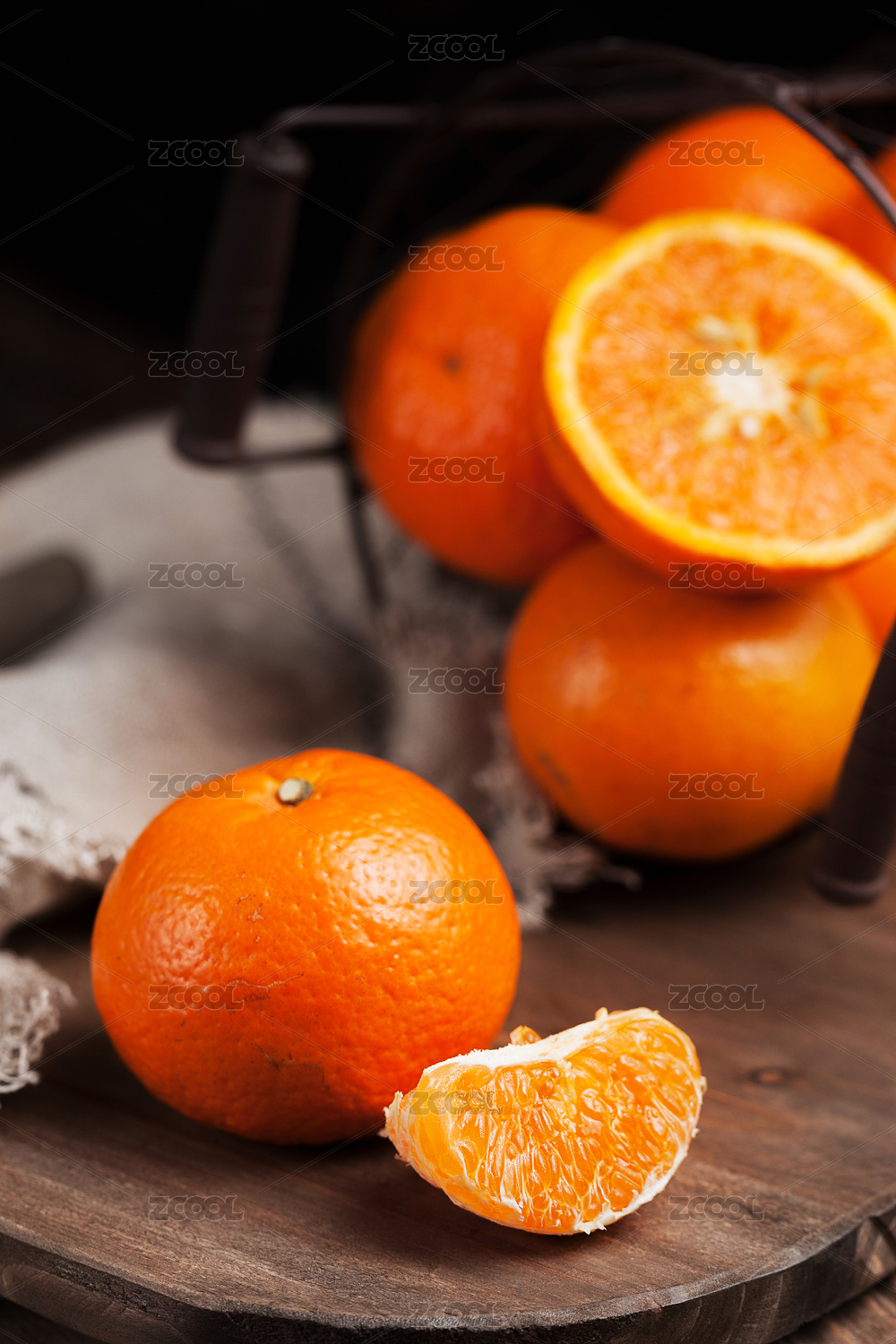 木板上放着一堆新鲜沃柑和切片的蜜橘