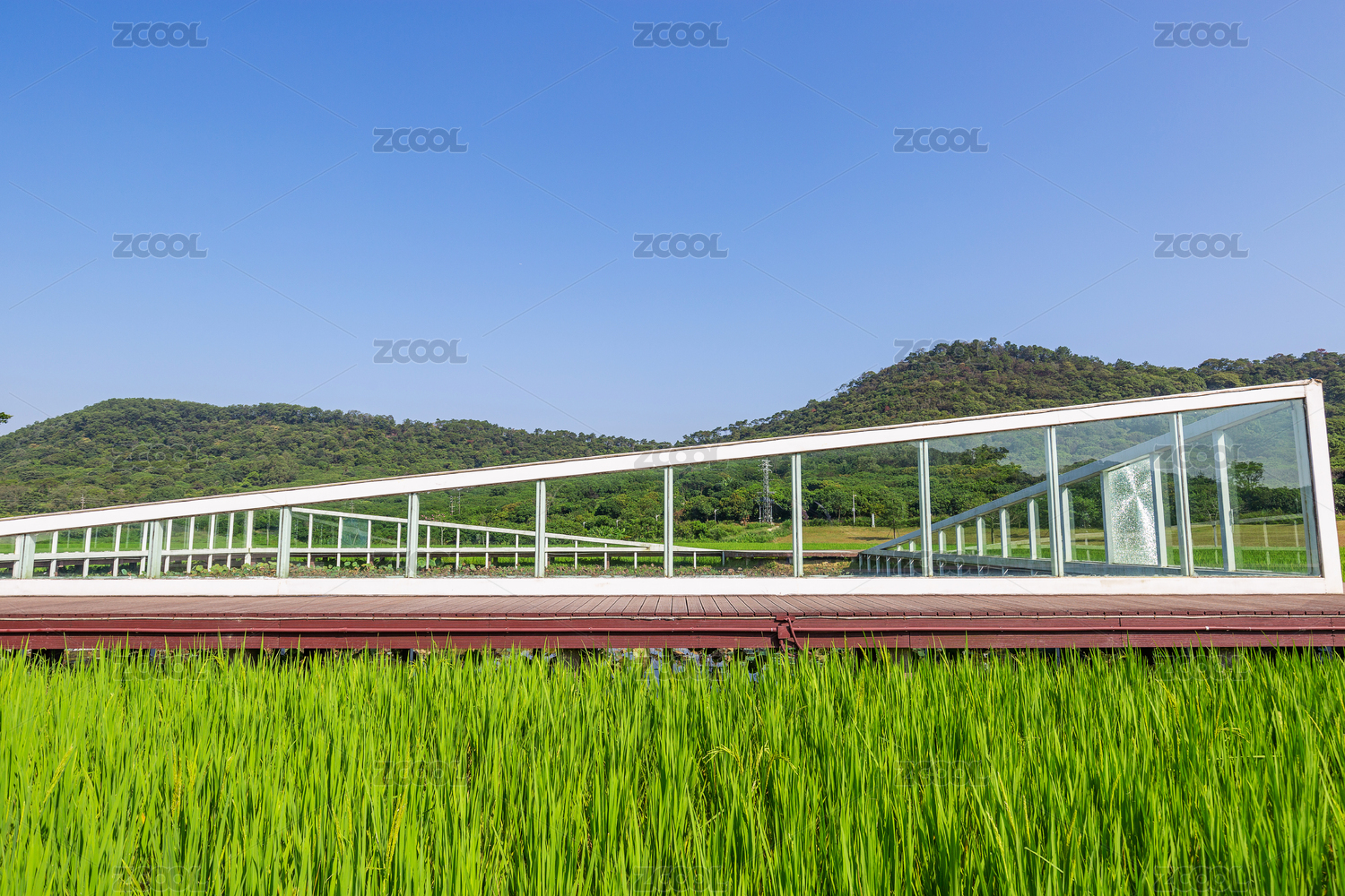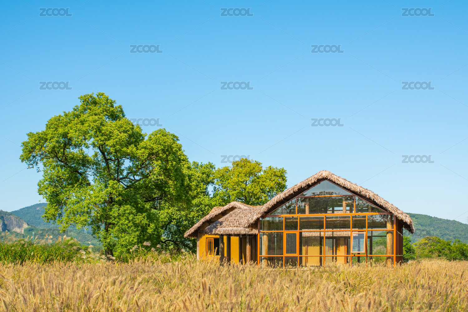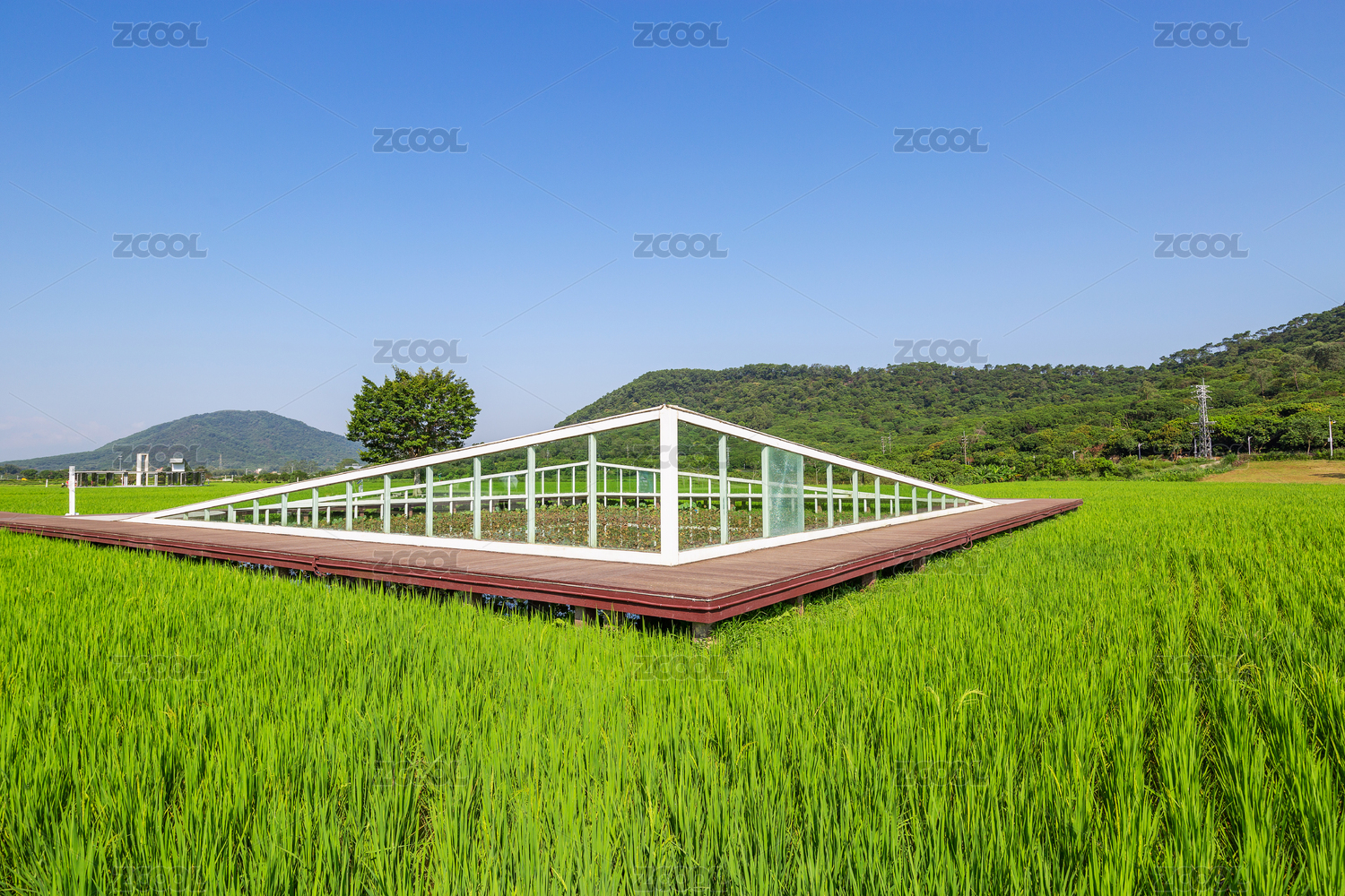 杭州良渚古城遗址公园田园风光中的玻璃小屋