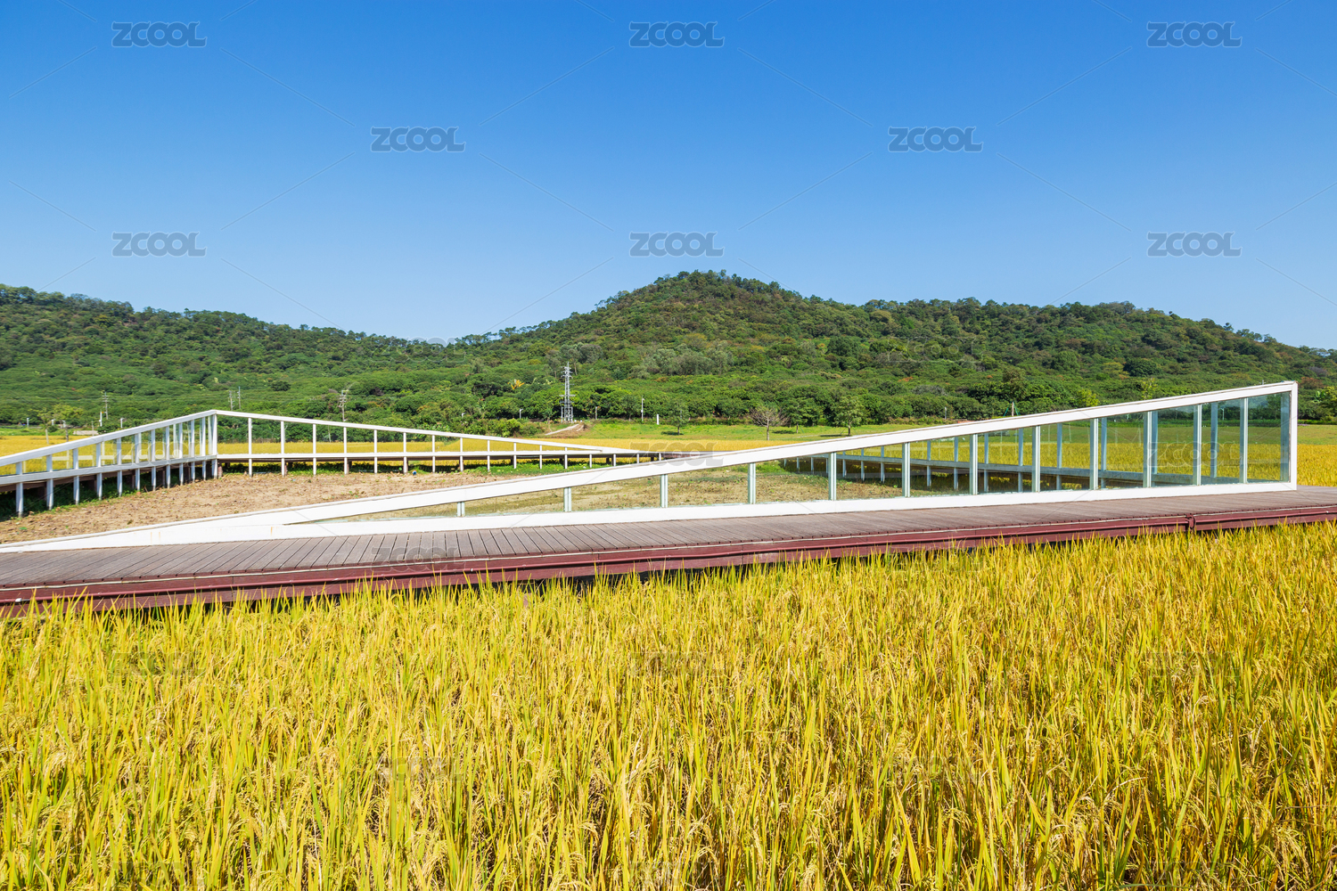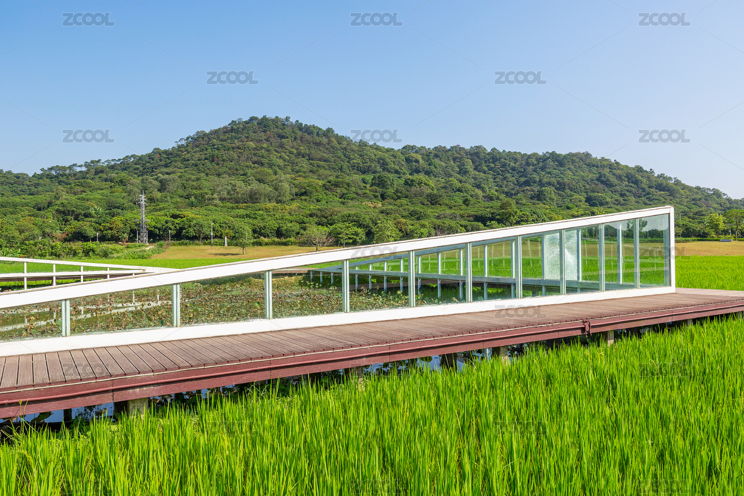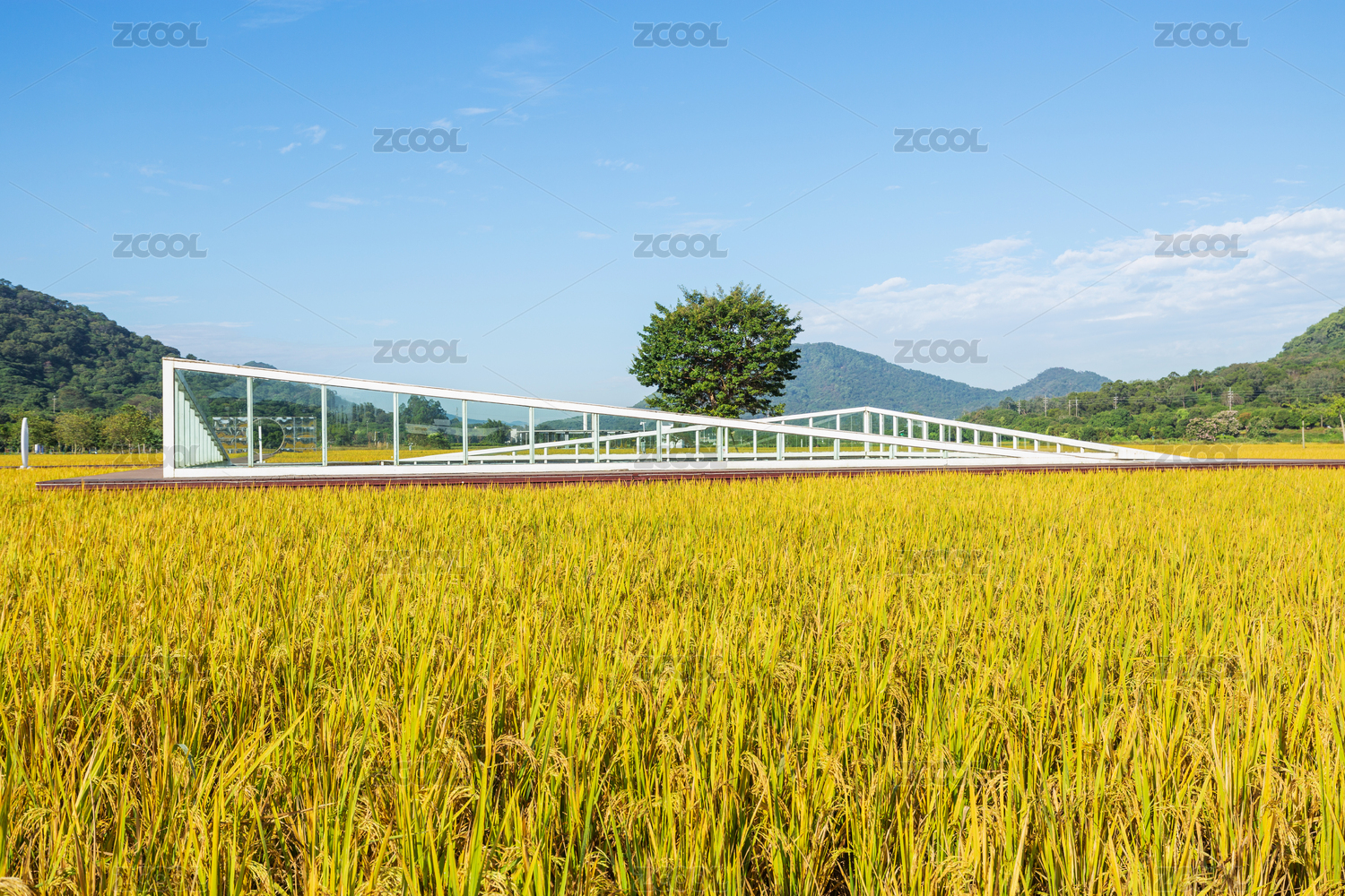 杭州良渚古城遗址公园田园风光中的玻璃小屋