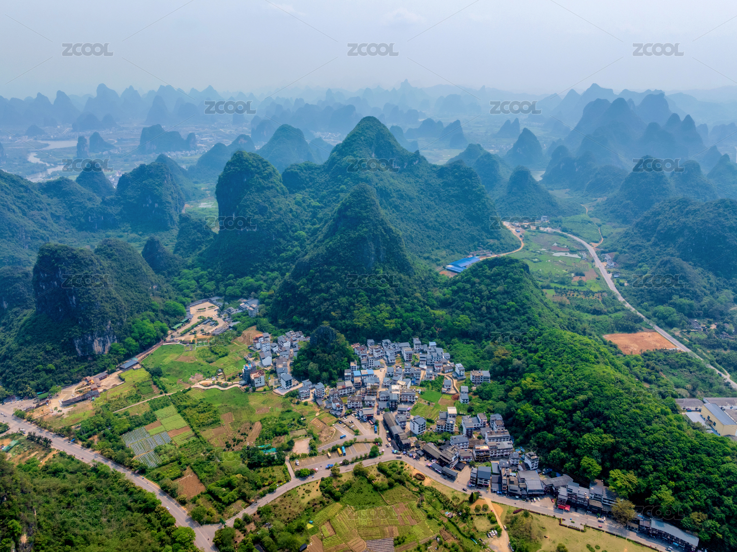 中国广西桂林兴坪古镇老寨山鸟瞰