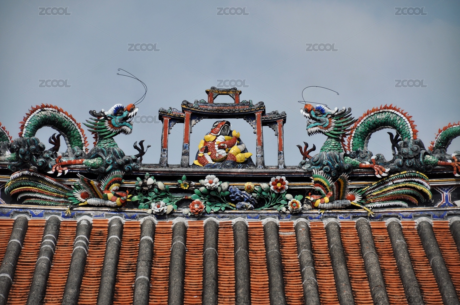 中国潮汕地区传统古建上的灰塑嵌瓷雕塑