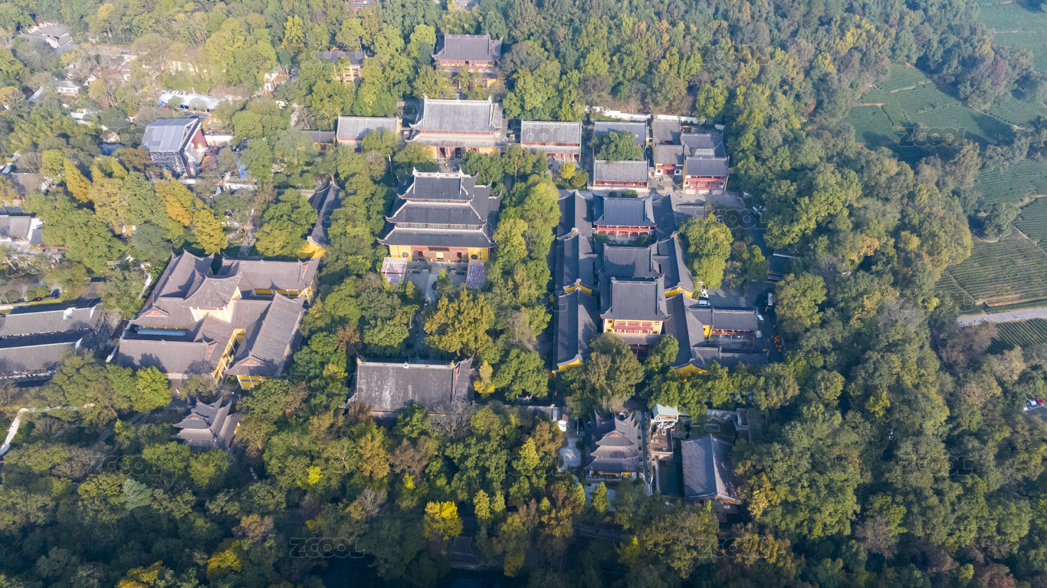 航拍秋季日出时的南京栖霞山下栖霞寺