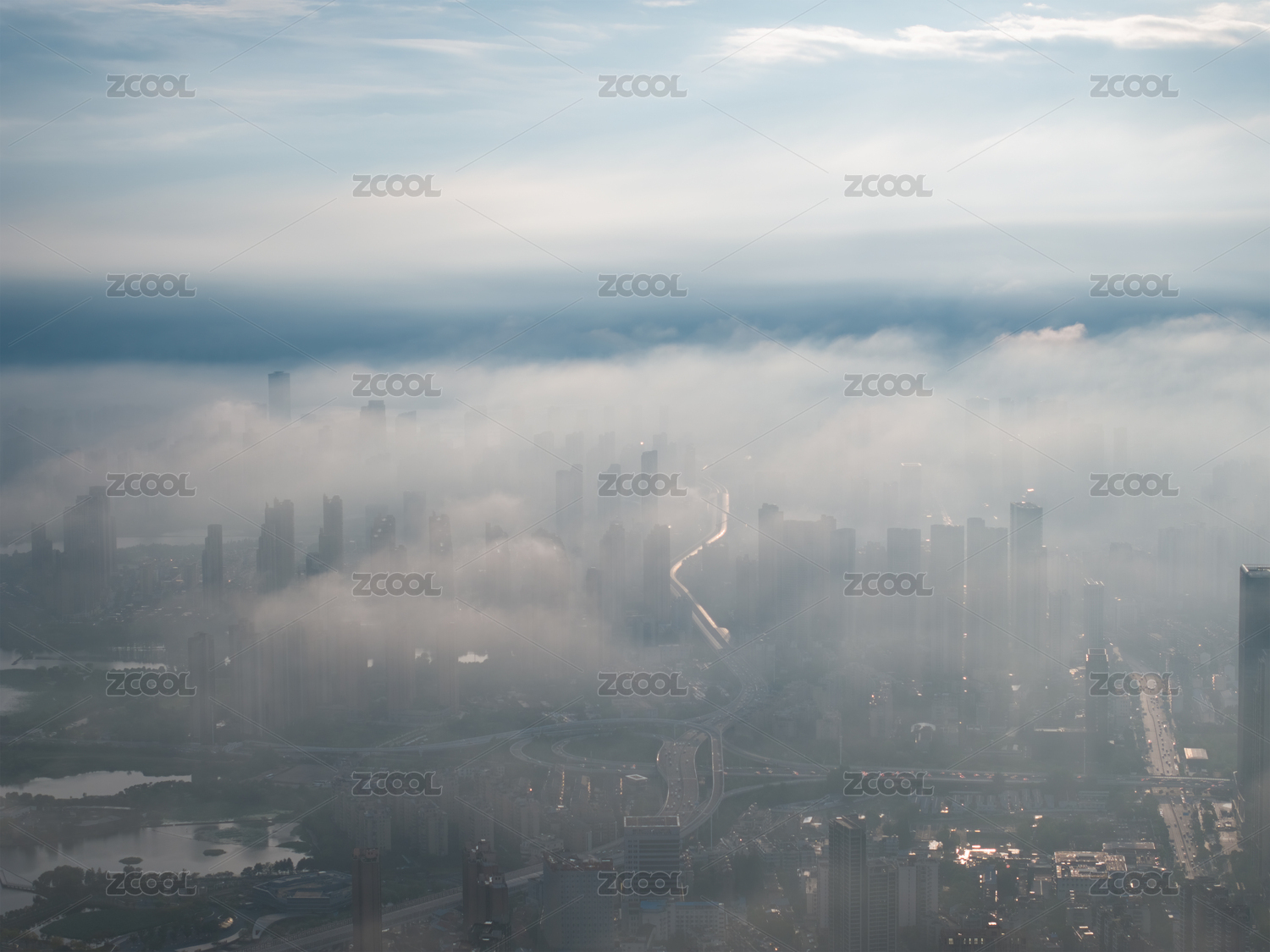 航拍中国天津滨海新区于家堡金融区清晨平流雾