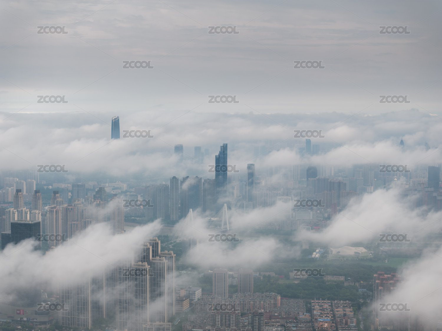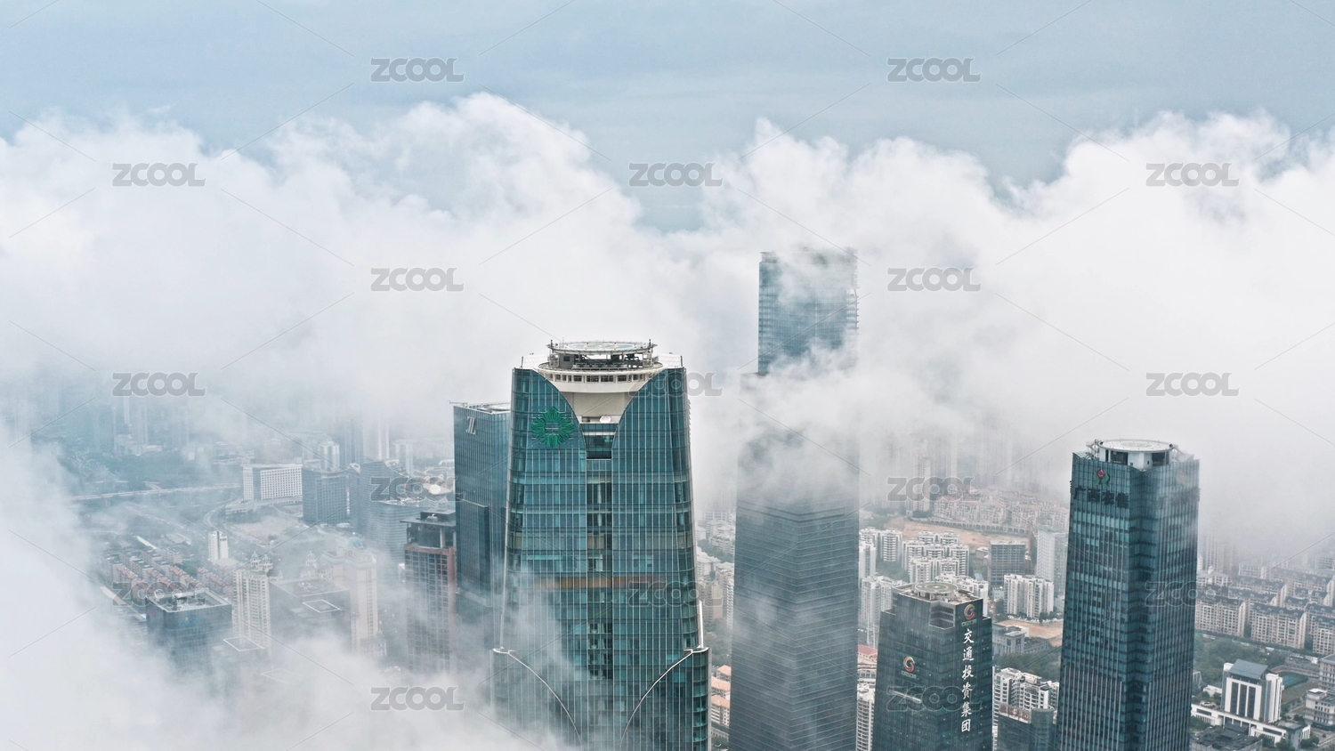 广州珠江岸城市高楼与云雾缭绕风光航拍