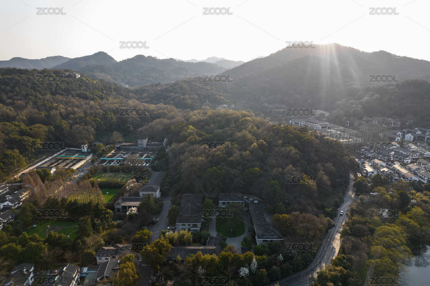 湖畔山间建筑群航拍