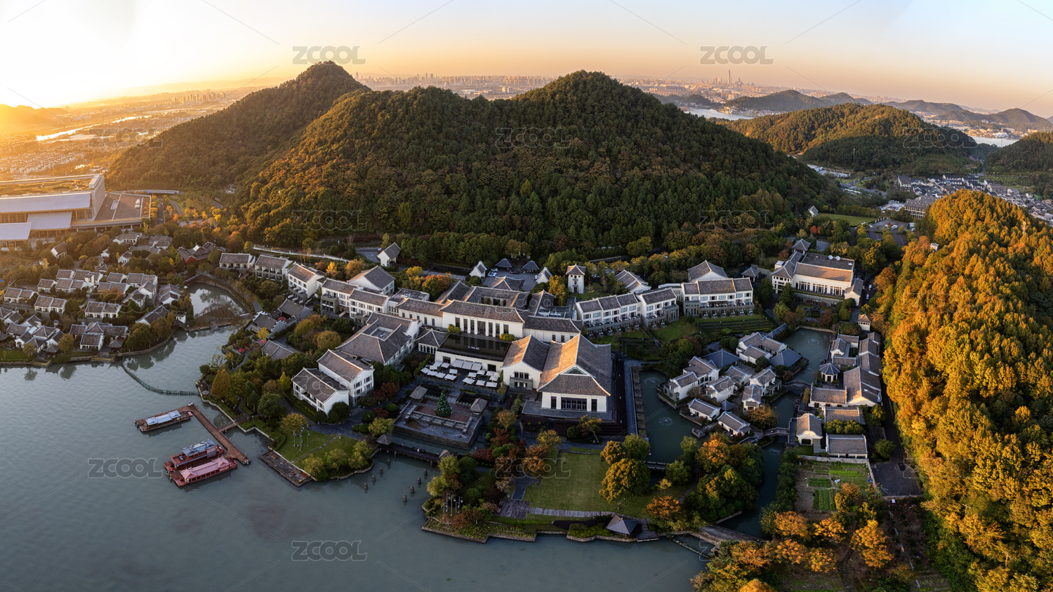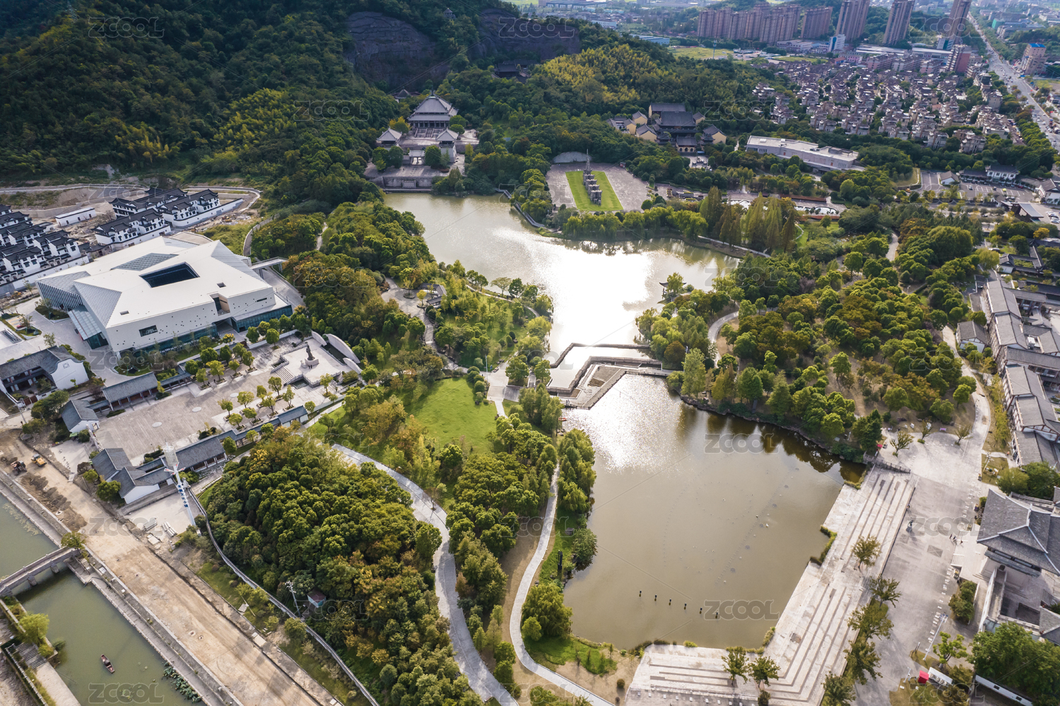 湖畔中式建筑群航拍
