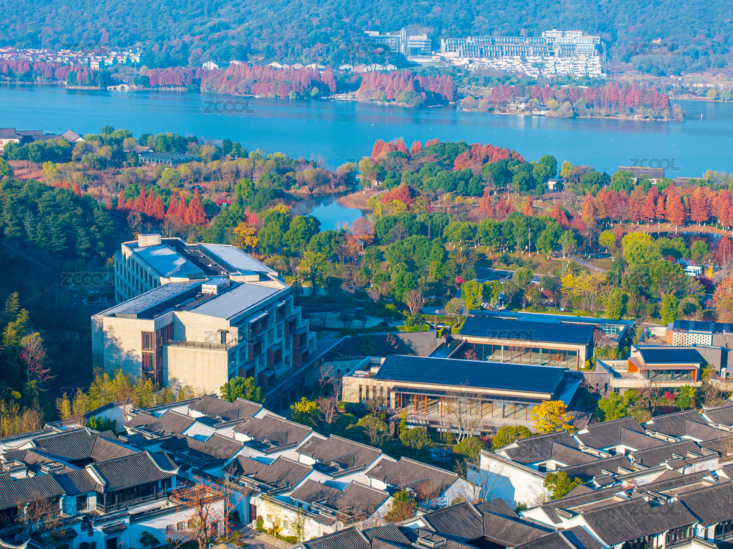 湖畔建筑群与秋色森林
