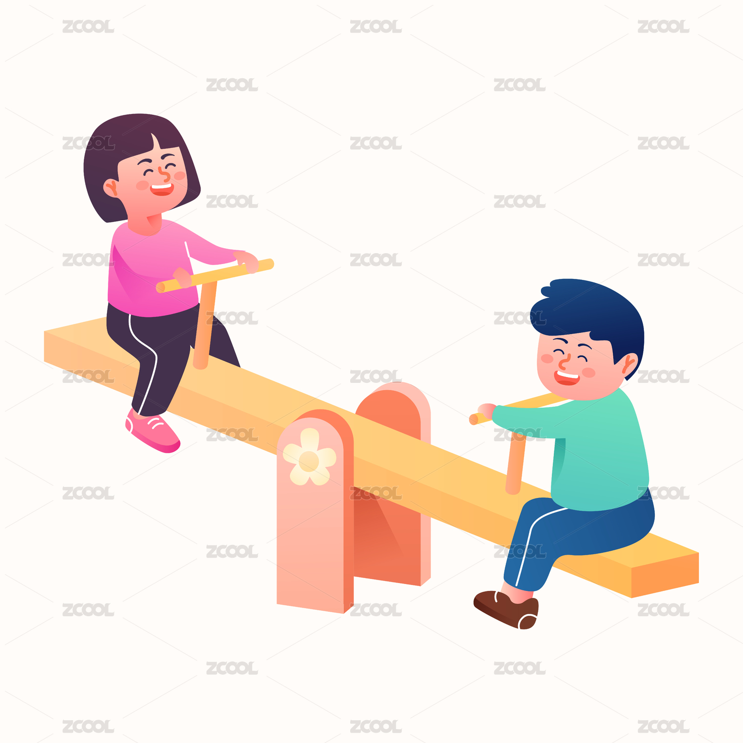 卡通六一儿童节小孩玩跷跷板矢量节日插画