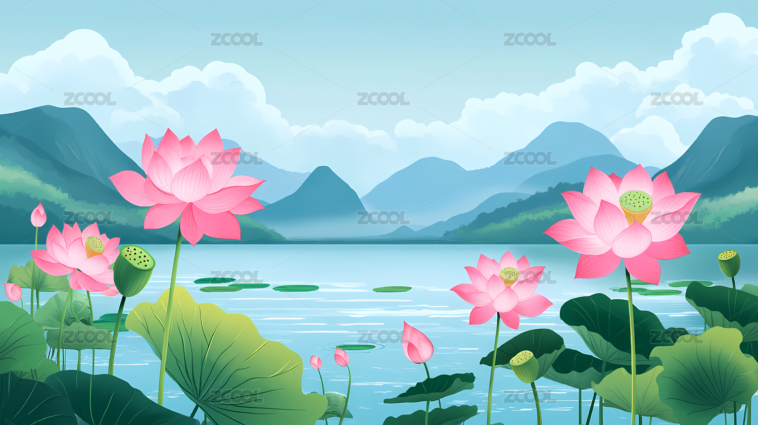 户外,夏天,插画,花,植物,天空,荷花,风景,叶子,AI数字艺术