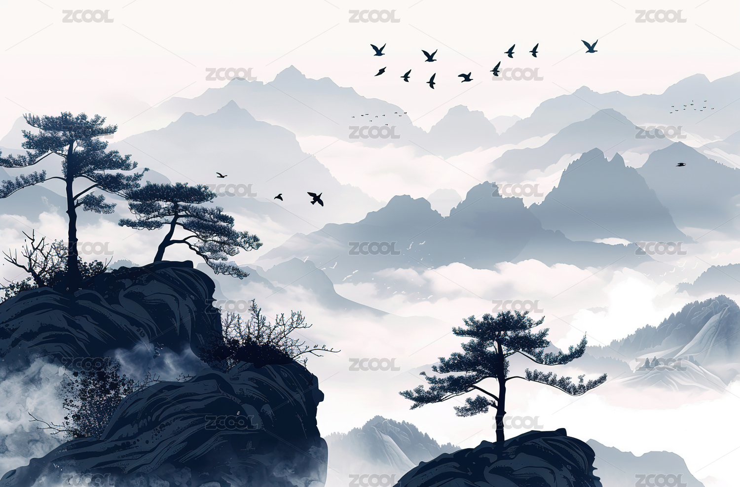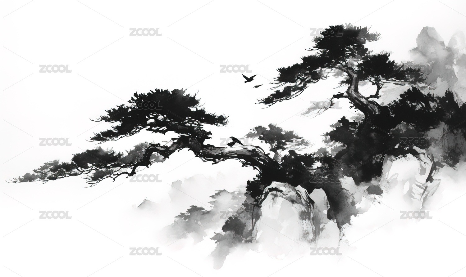 水墨写意飞鸟远山