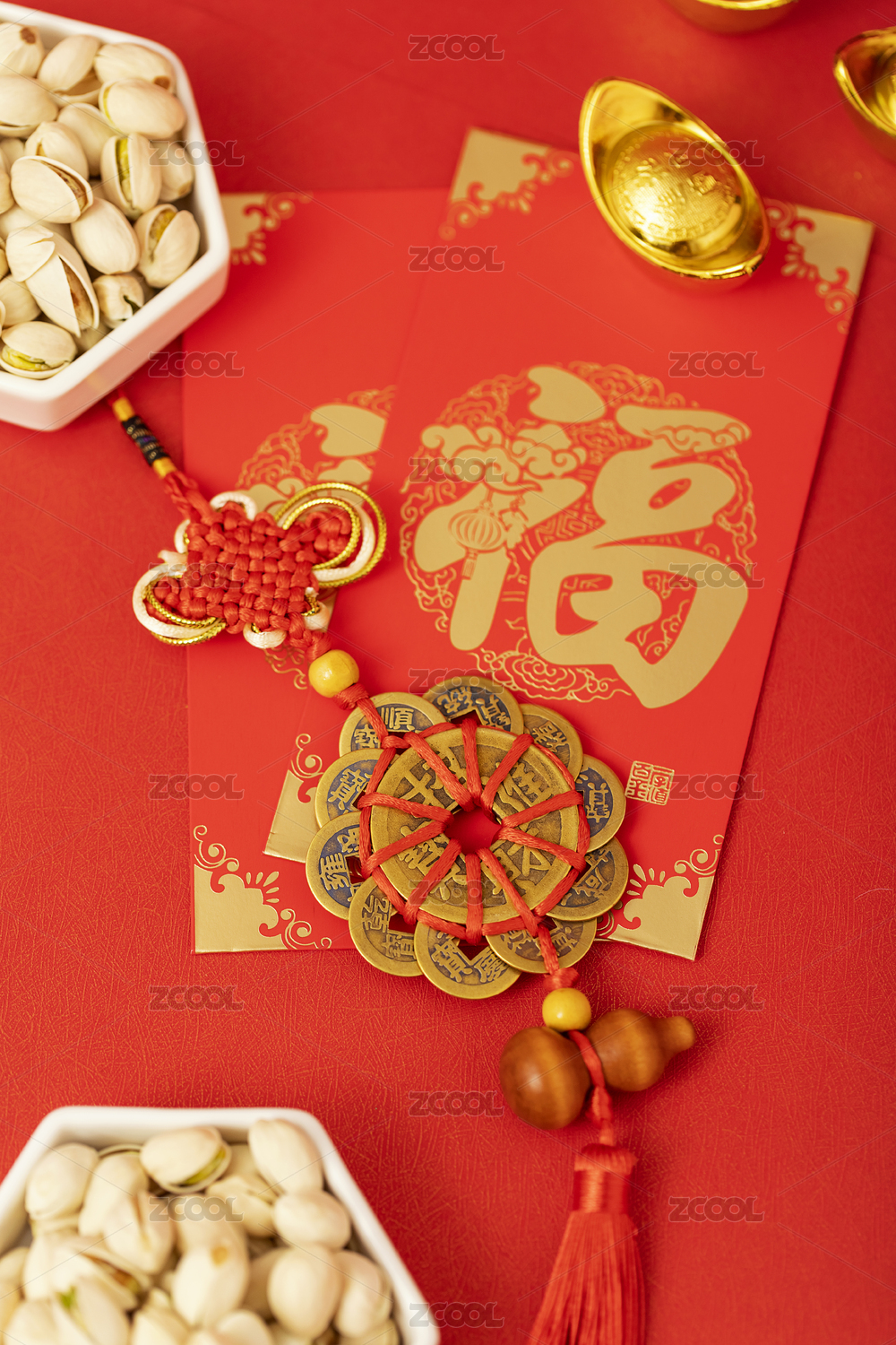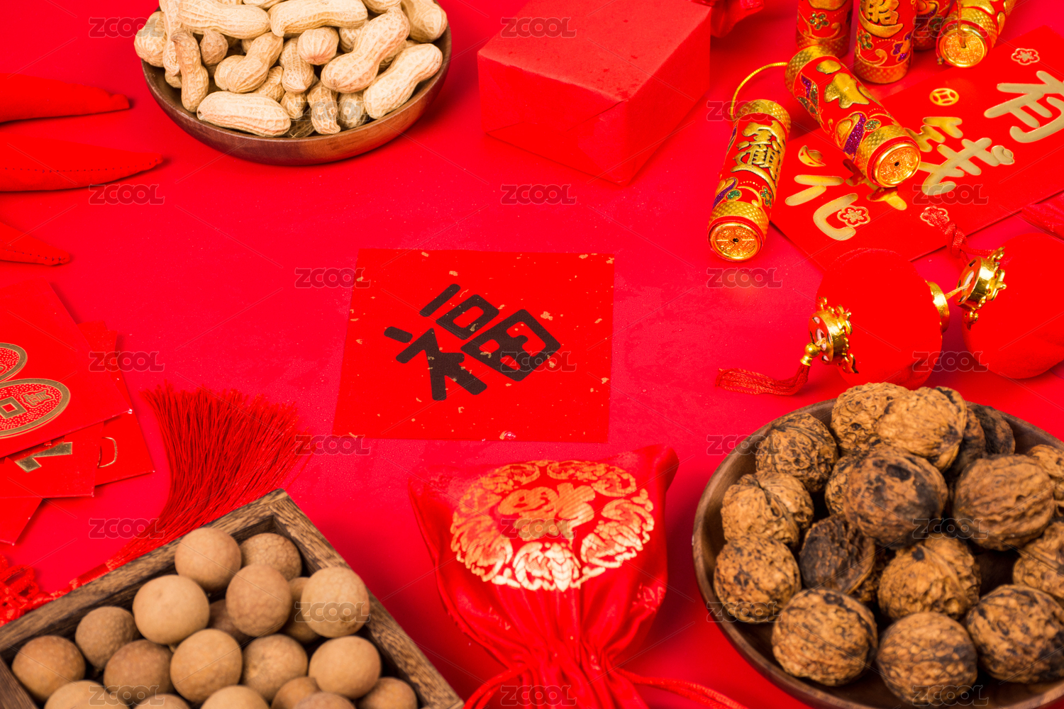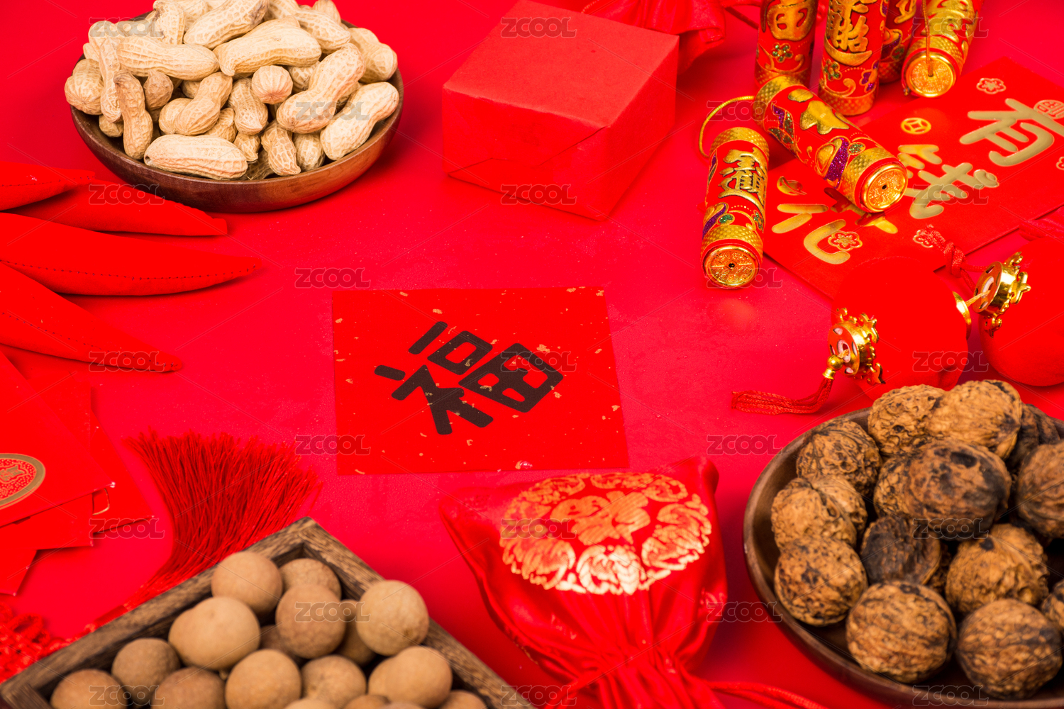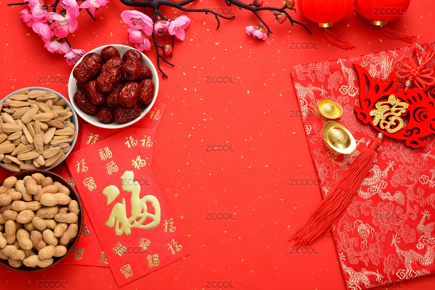 红色背景上的红包、元宝、中国结、红枣和花生瓜子坚果