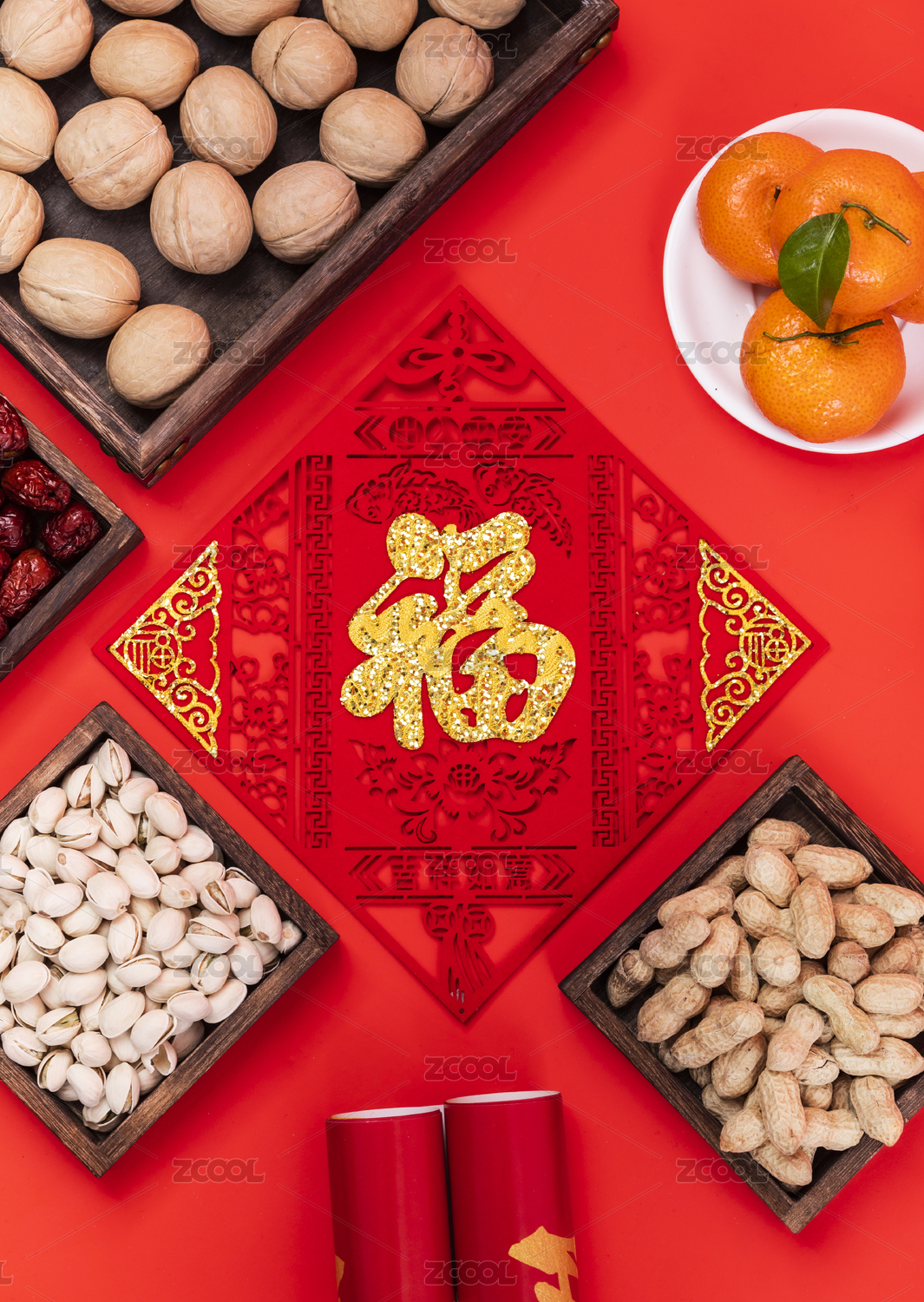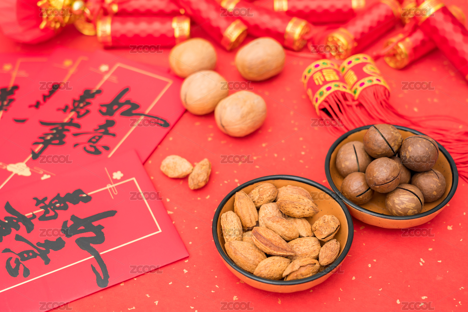 低角度拍摄中国春节红色背景下的各类坚果年货