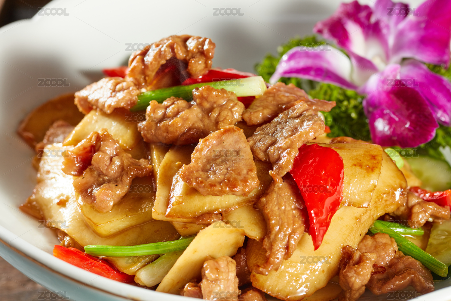 摆在盘子的茭白炒肉