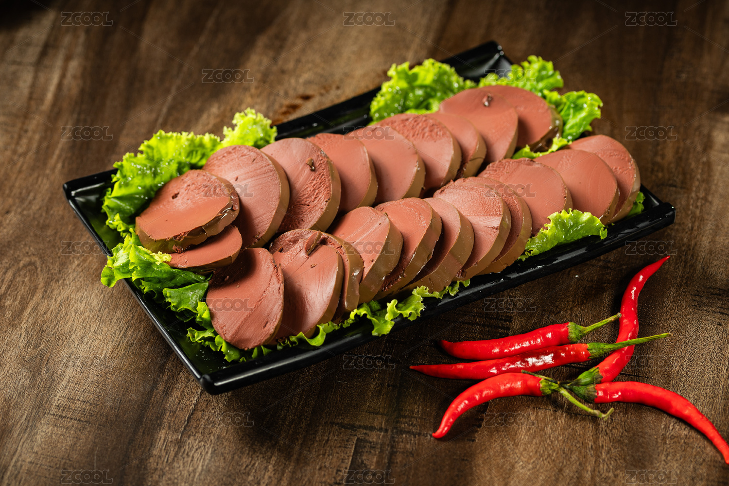木桌上长方盘里的重庆火锅食材鲜鸭肠
