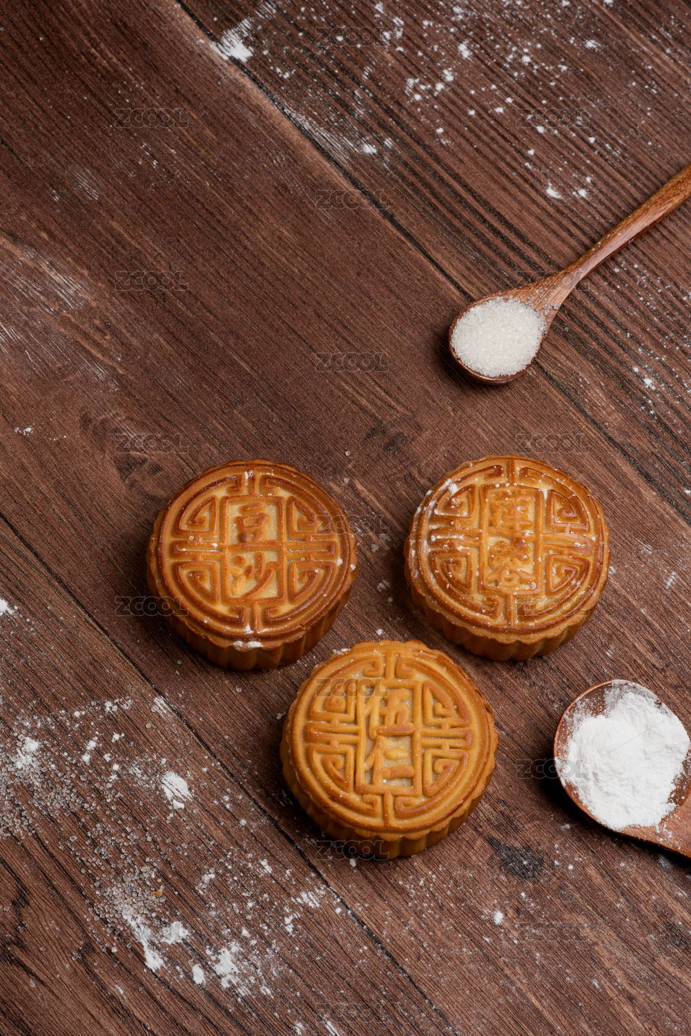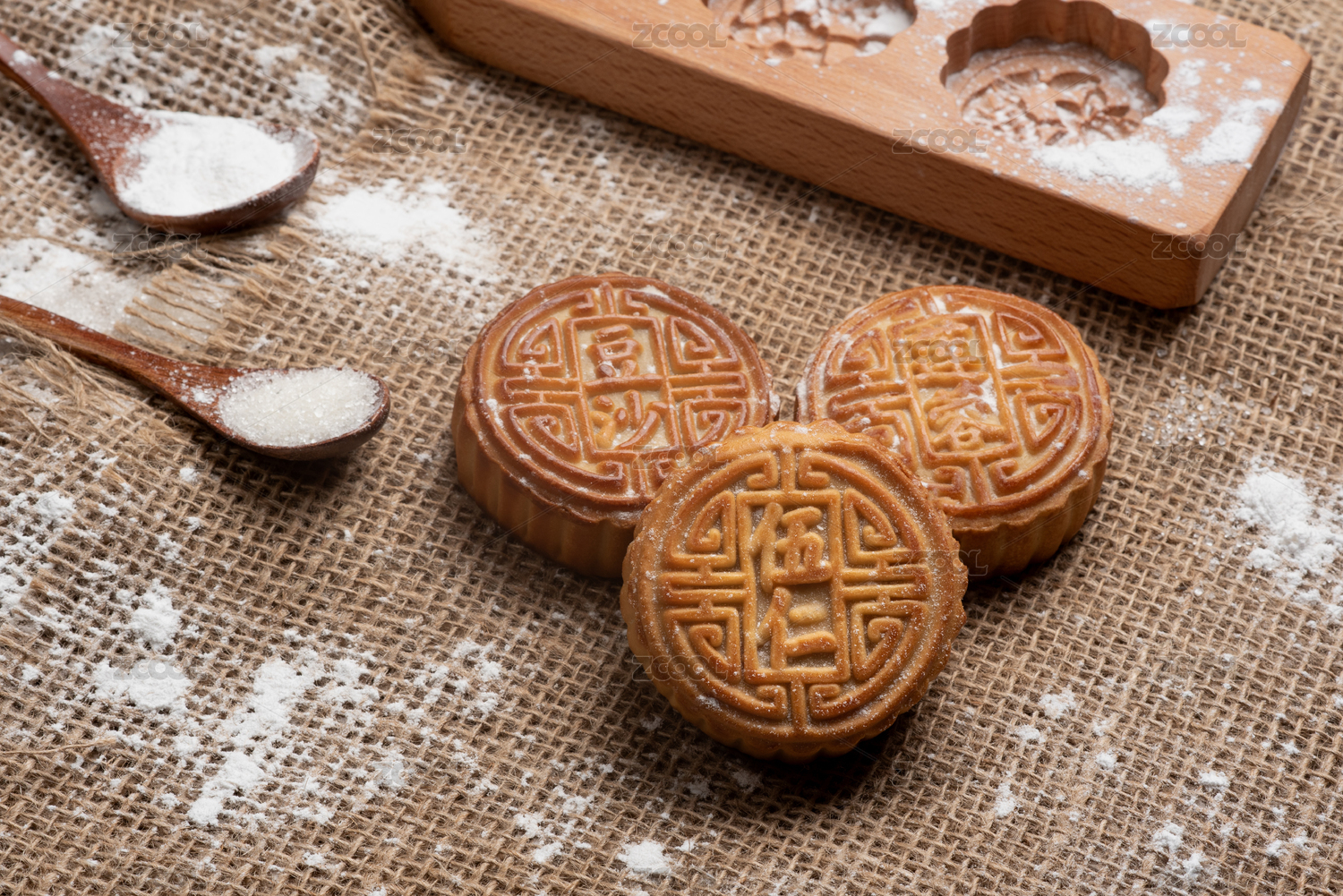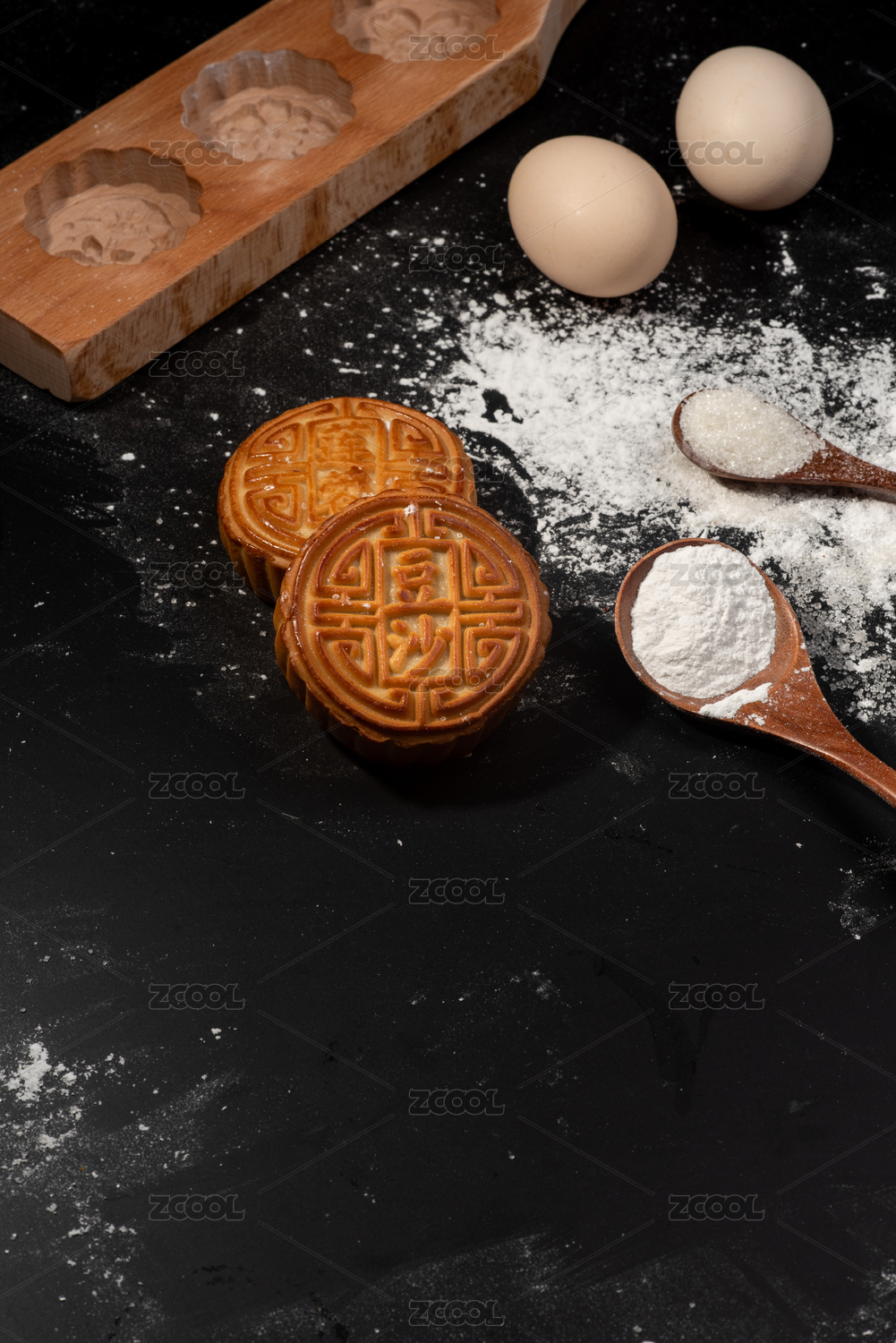 红褐色木板桌面上的月饼,和洒落在旁边的制作原料