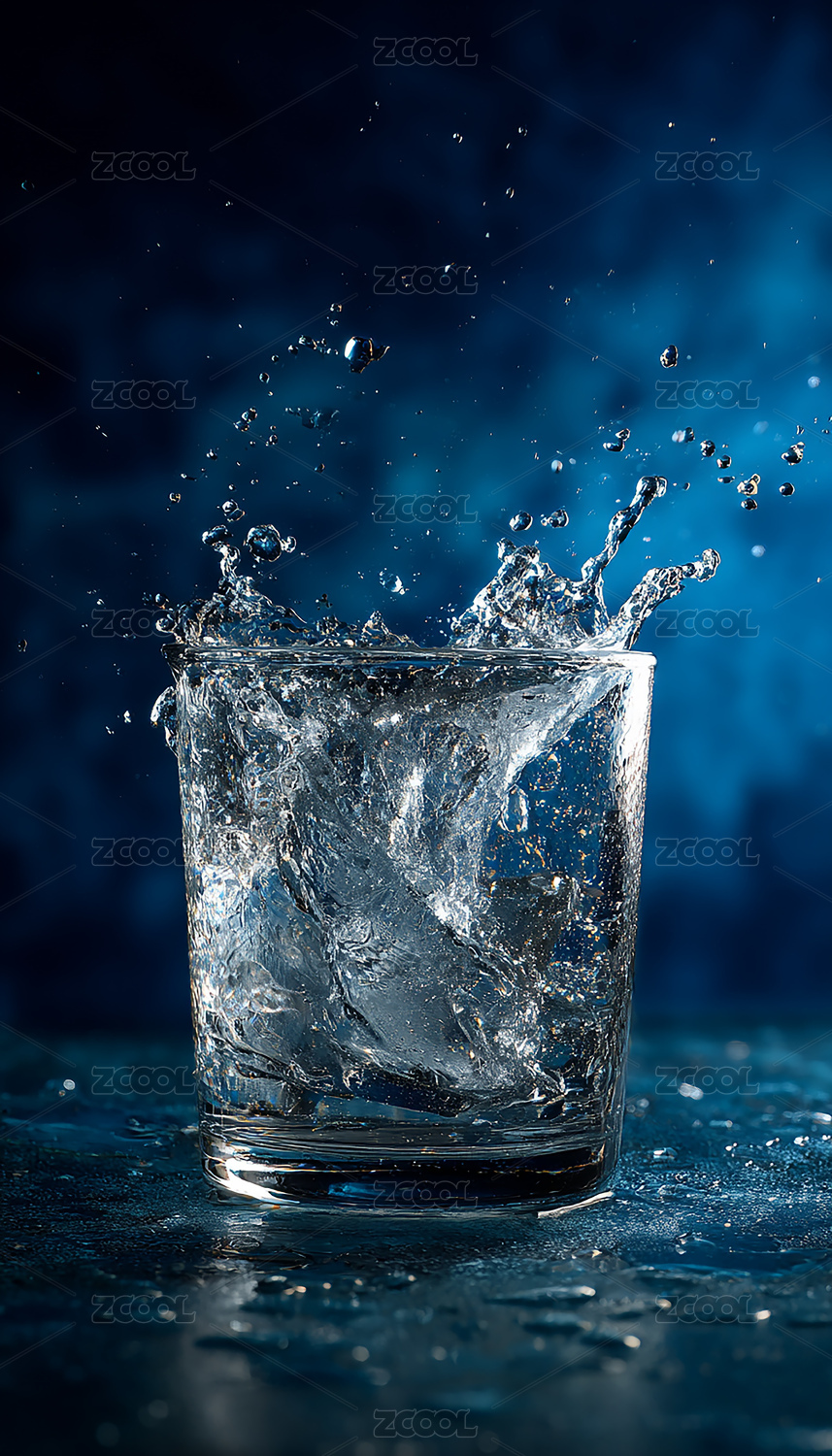 威士忌酒杯碎冰酒水飞溅动态特写摄影