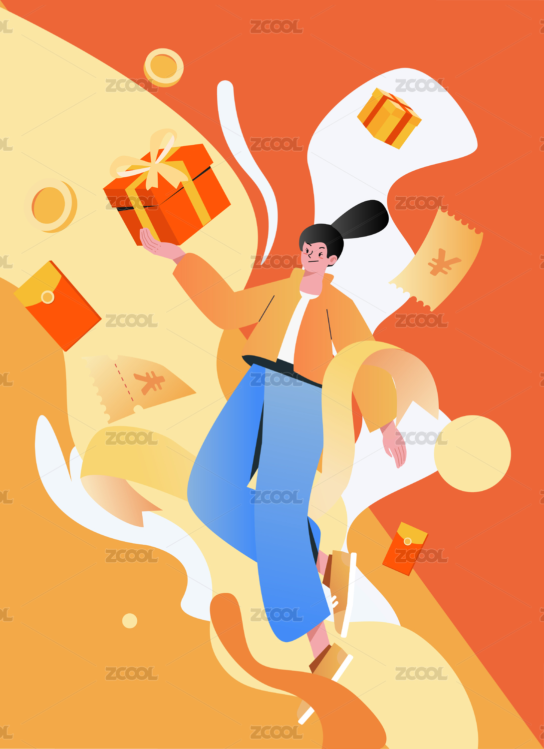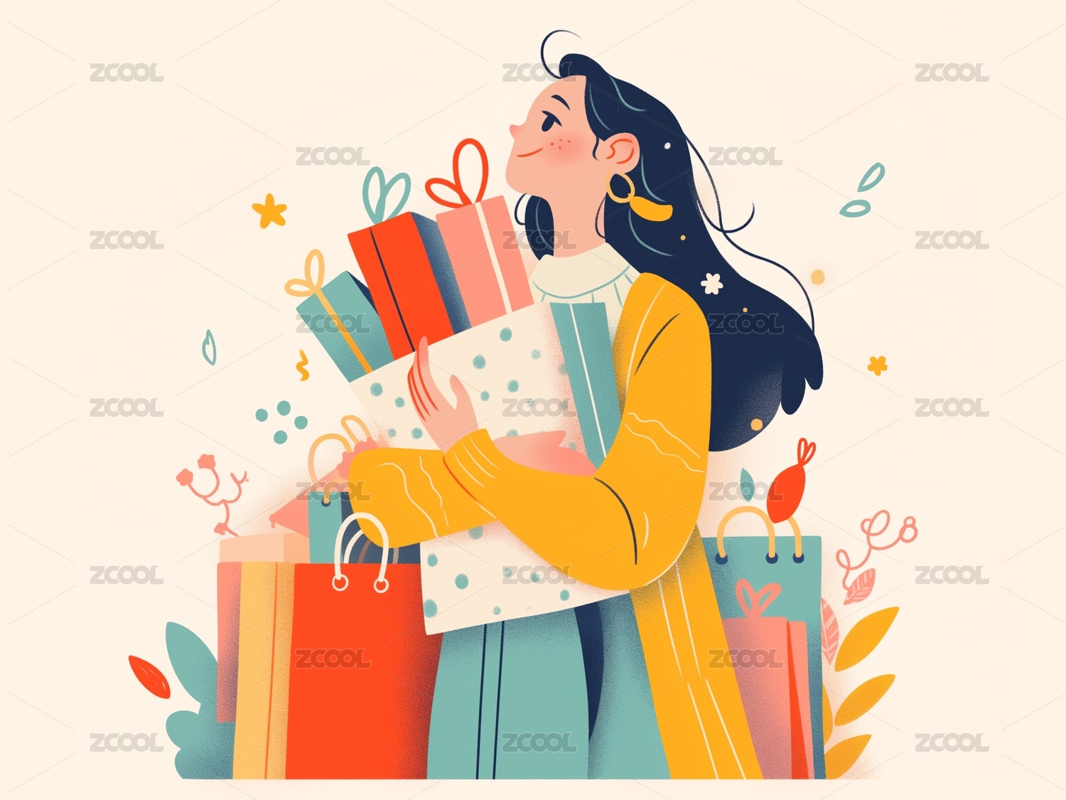 女孩手捧礼物,背景装饰着购物袋和时钟