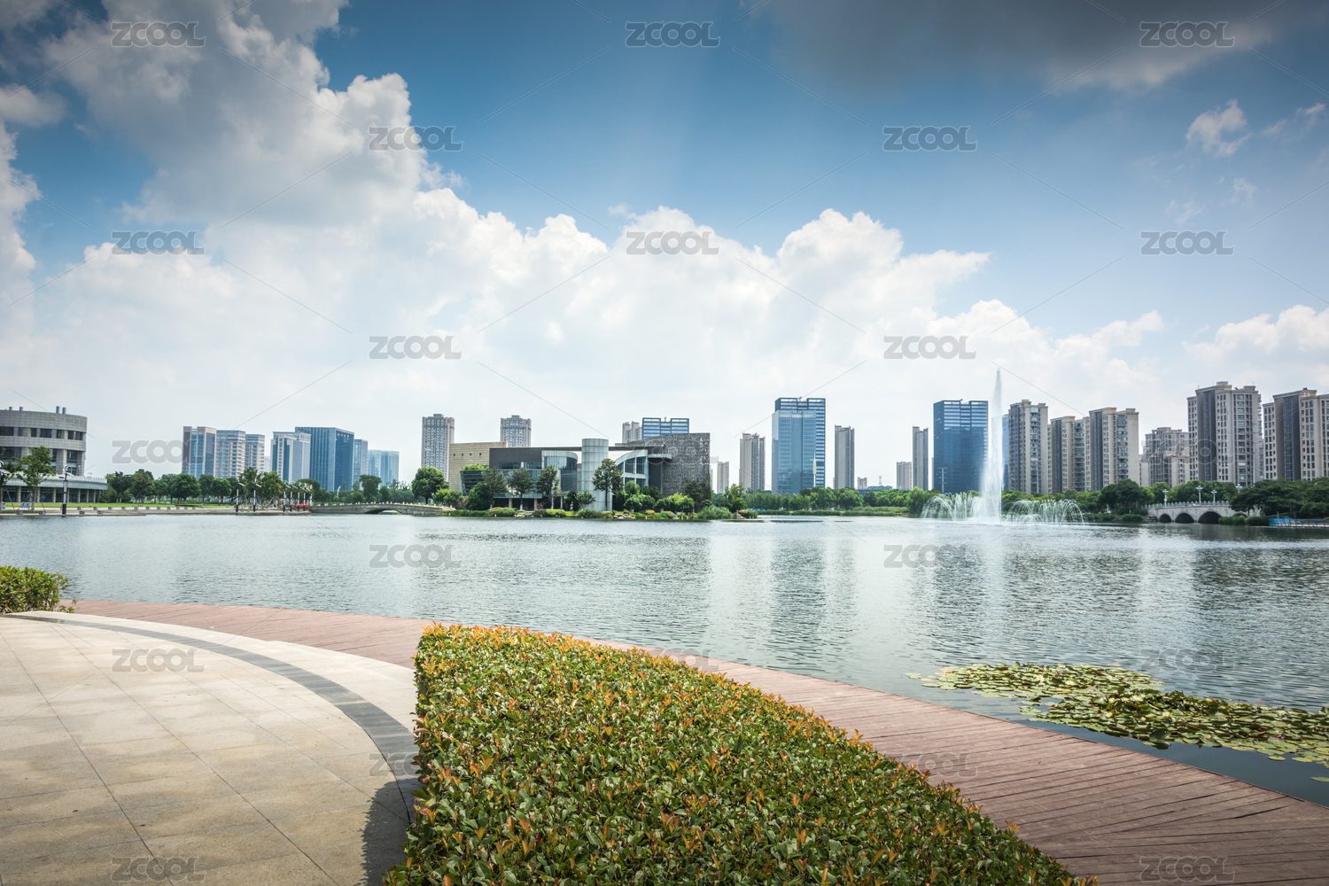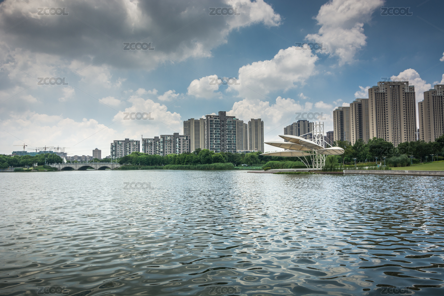 中国浙江上虞曹娥江滨大草坪与高层建筑
