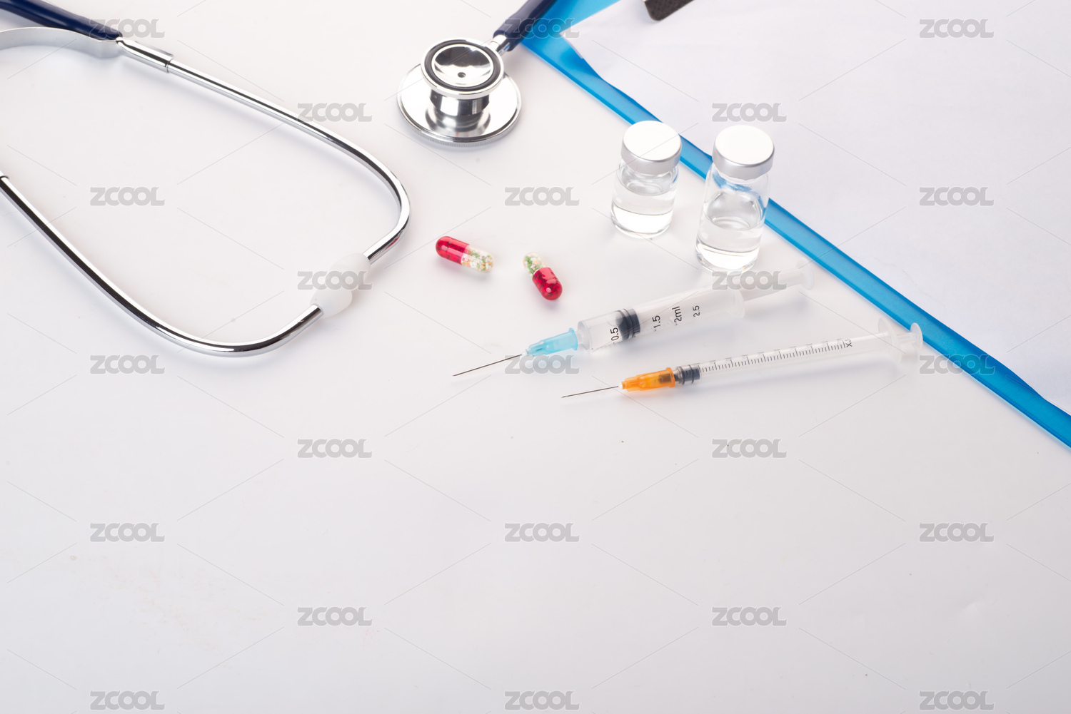 听诊器、疫苗和药品在白色背景上