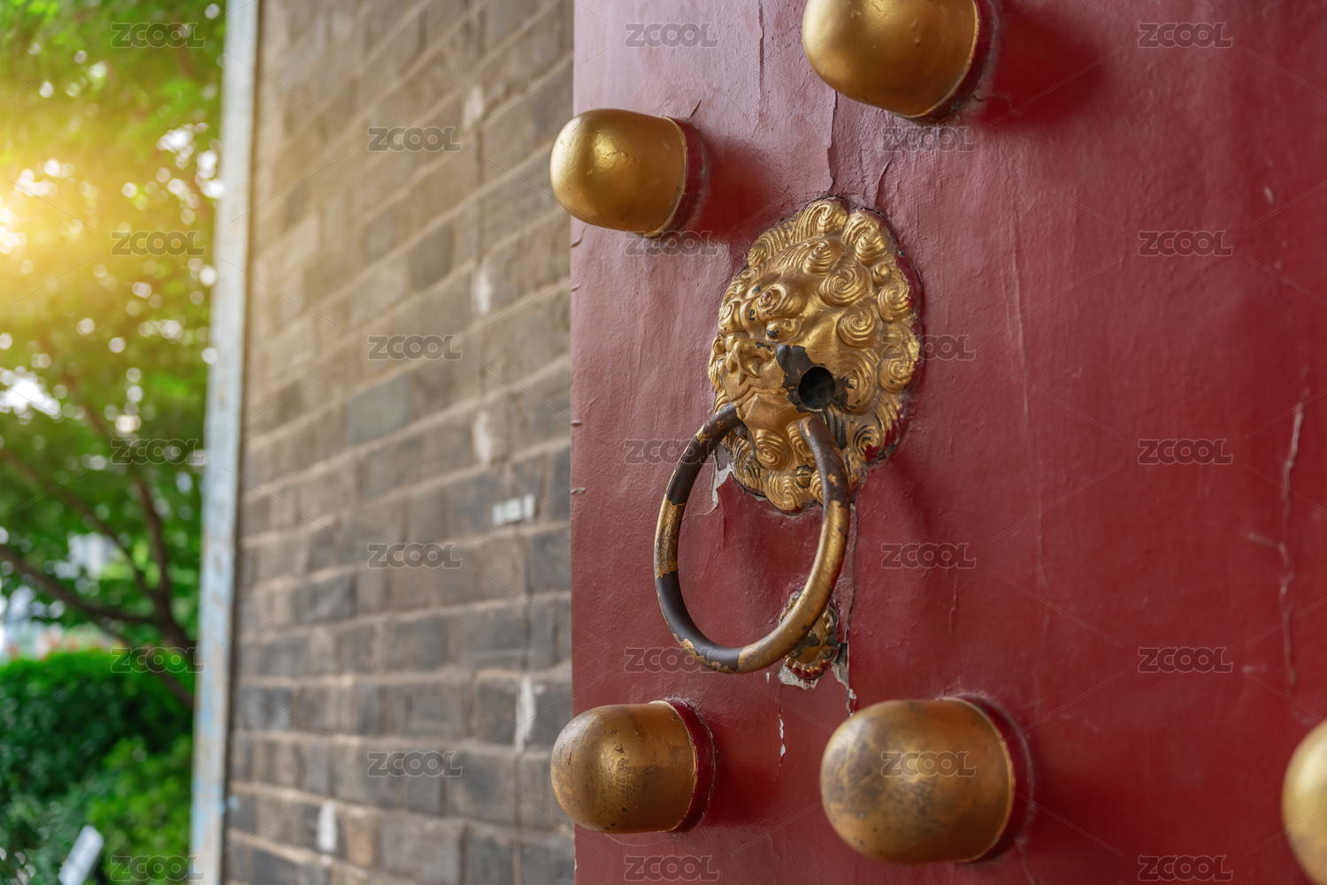 红色大门上的复古铜质门扣