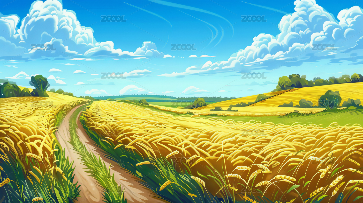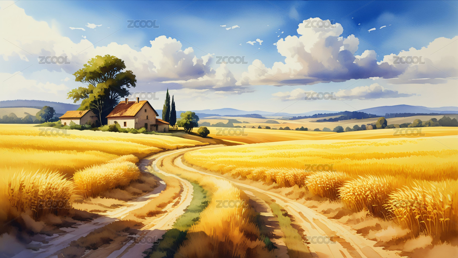 金色,麦田,插画,水彩,天空,麦子,AIGC202402