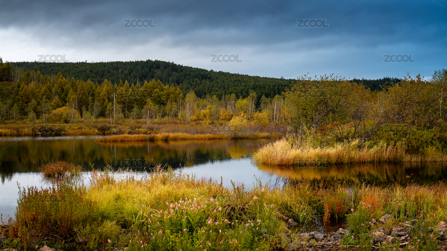 初秋薄暮下的阿尔山湖面一角
