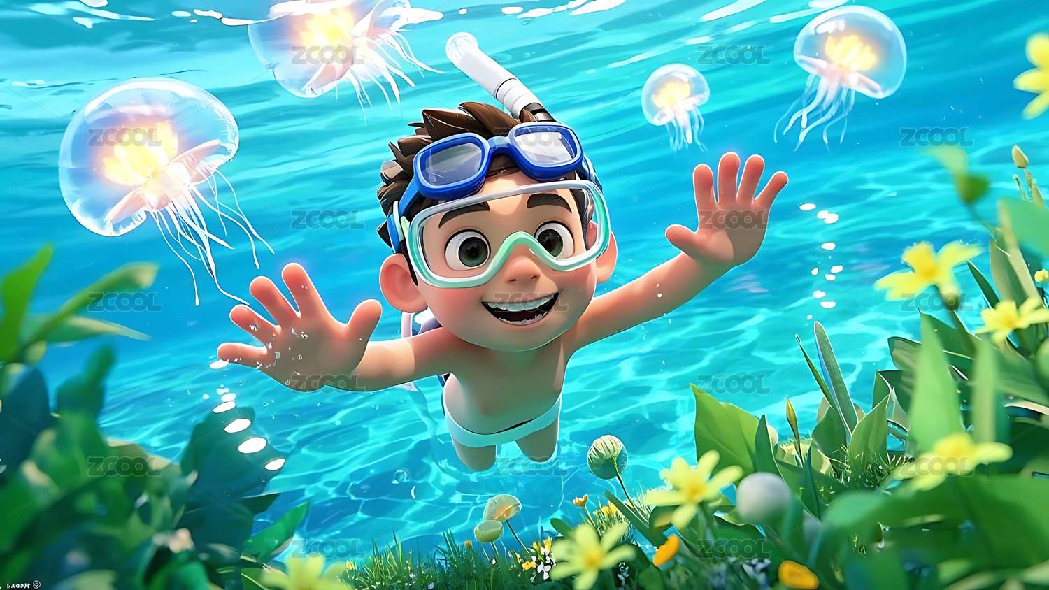 3D,卡通,潜水,海底,儿童,小孩,欢快,乐趣,游泳,互动