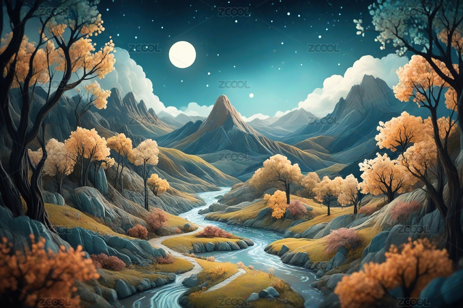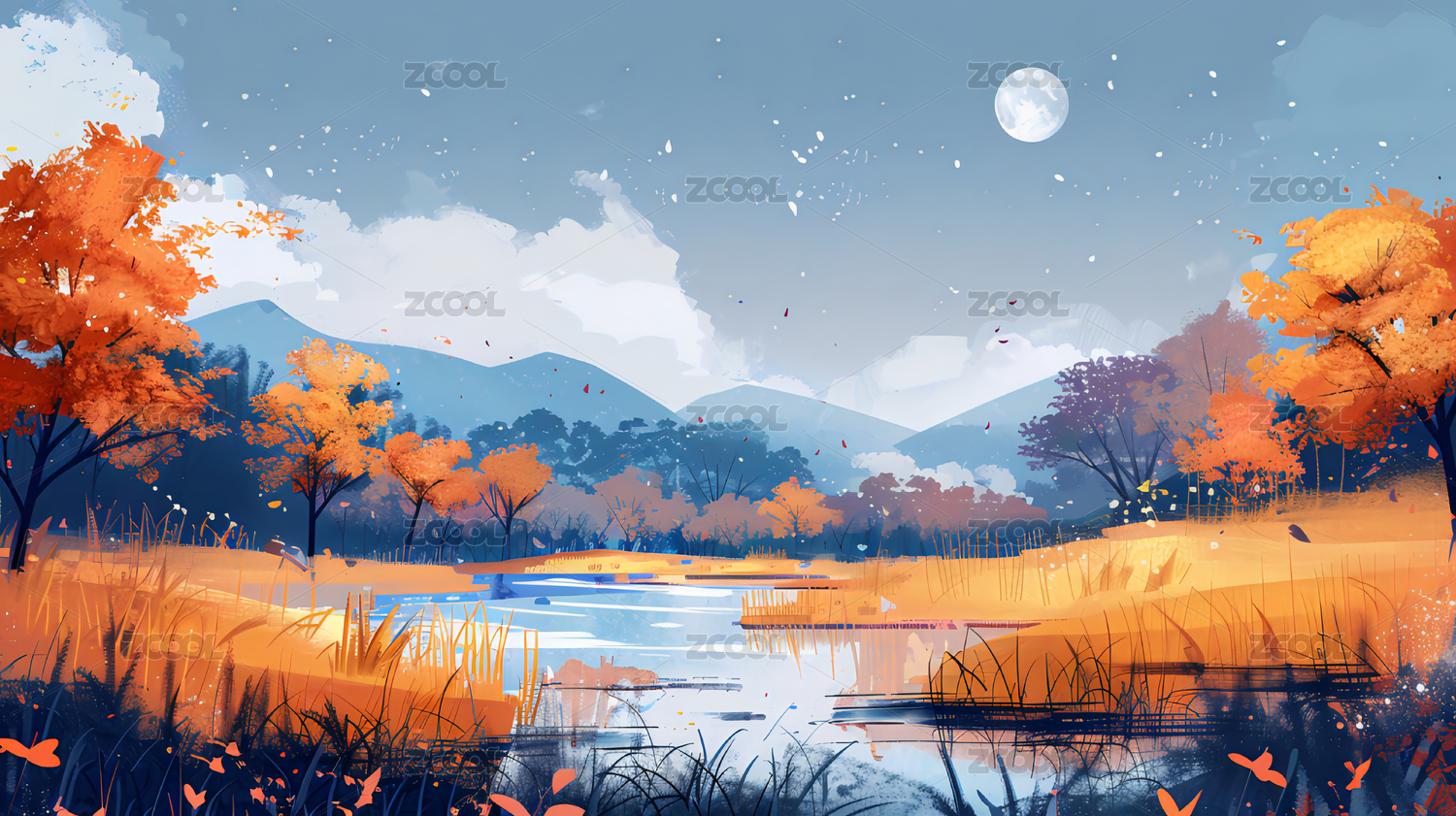 秋天,夜晚,森林,秋叶,小河,月光,神秘,宁静,树梢,丛林