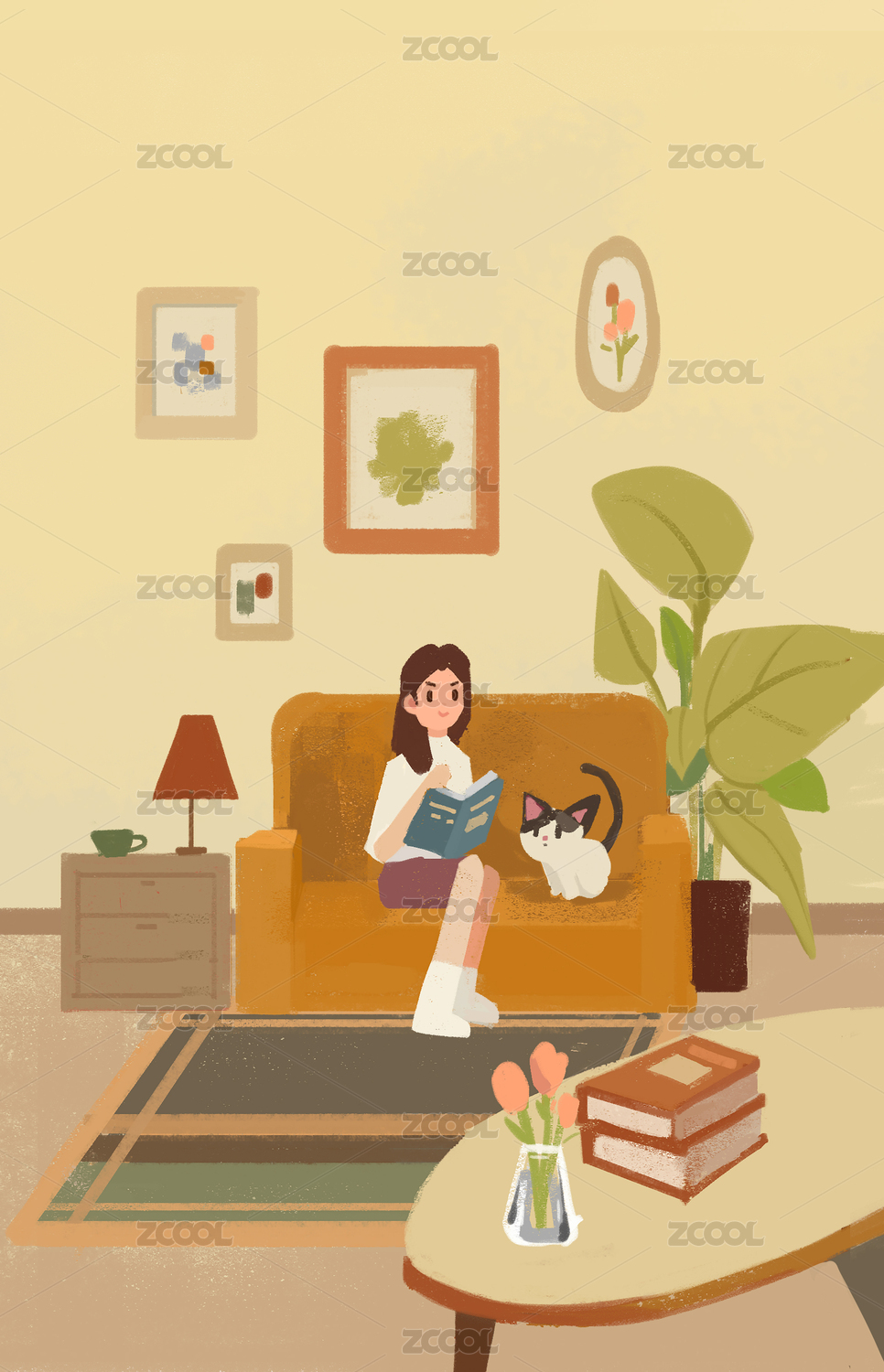 年轻女性在家看书插画