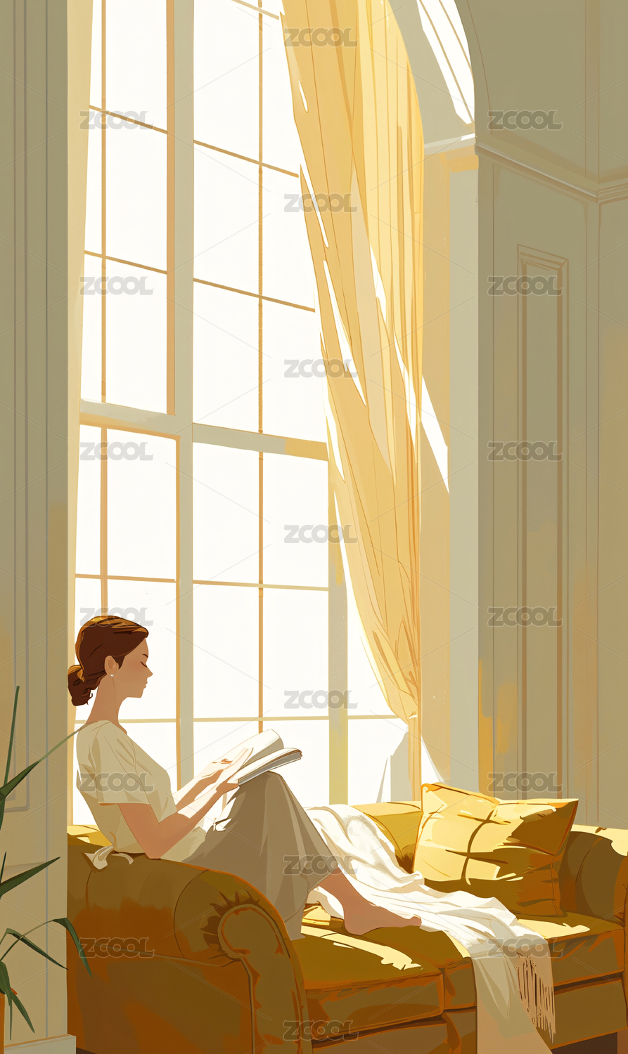 女孩坐在窗前沙发上看书时尚插画