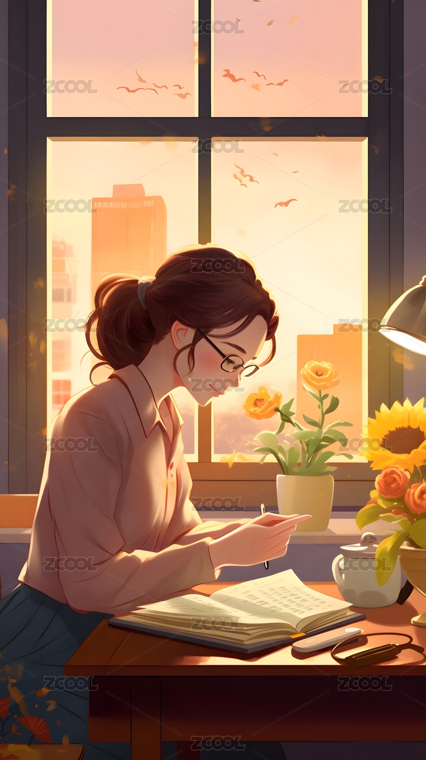 女孩坐在窗前看书