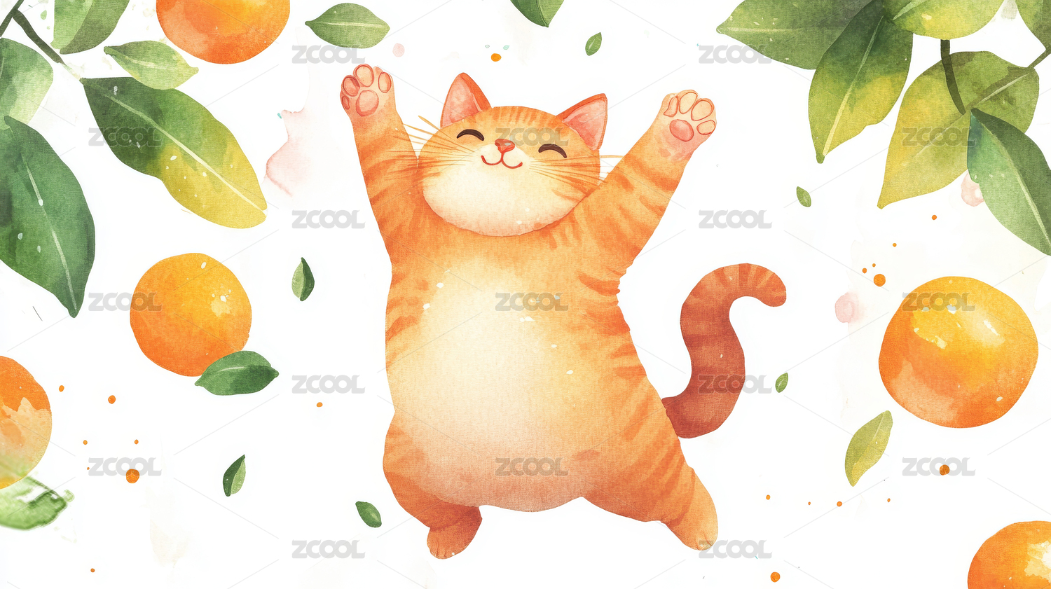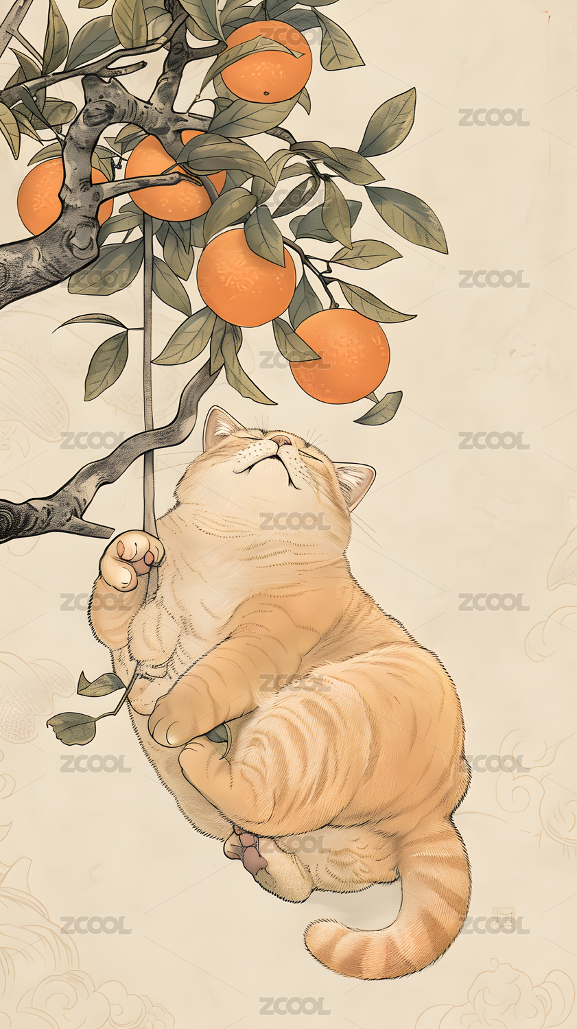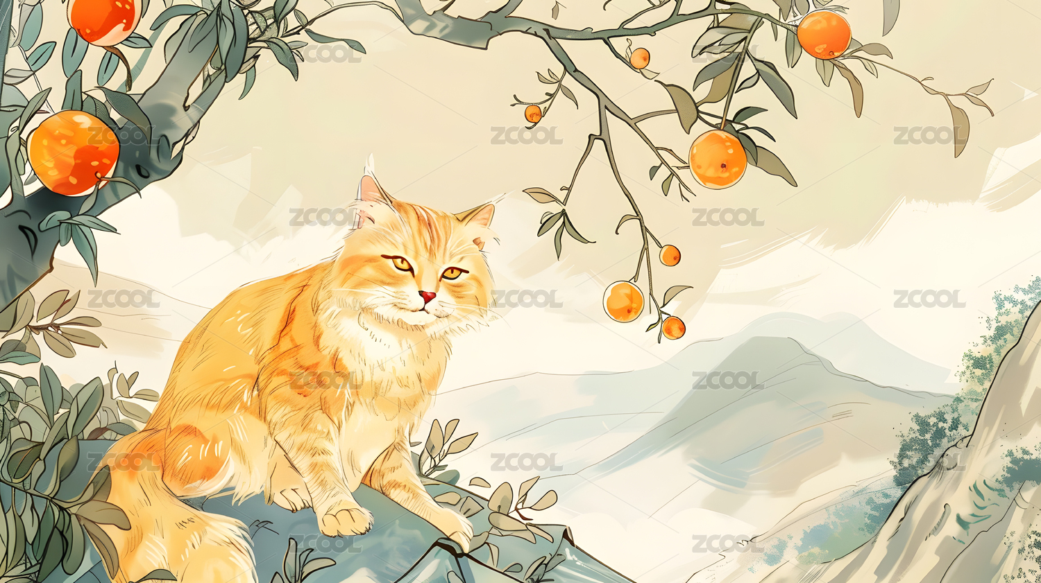 中国风,国风,古风,水墨画,猫,小猫,卡通,插画,橘猫