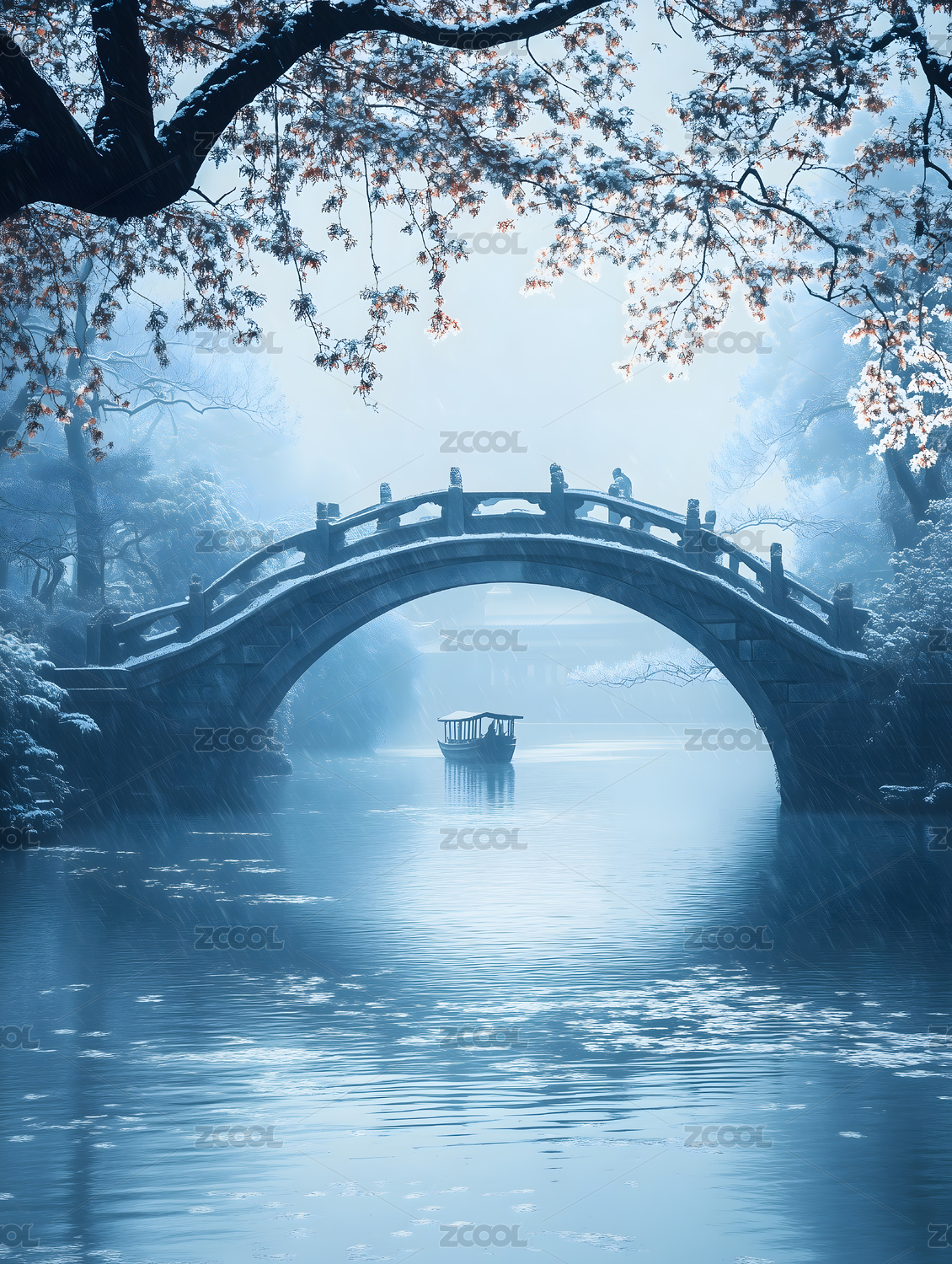 意境,建筑,风景,宁静,冬季,倒影,中国风,水墨画,水面,古亭