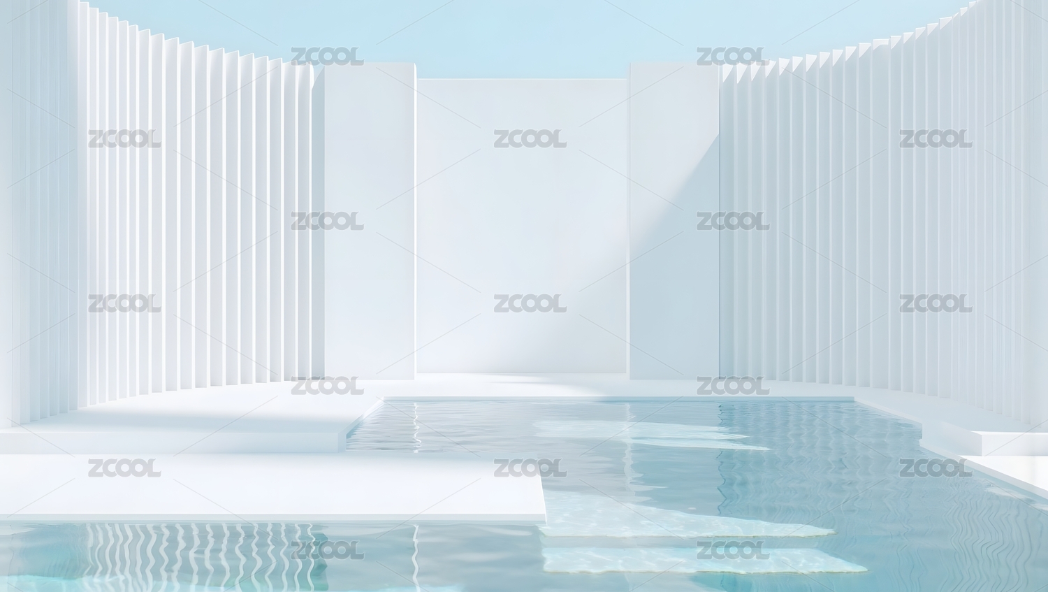 白色带有水面的室内场景3D渲染