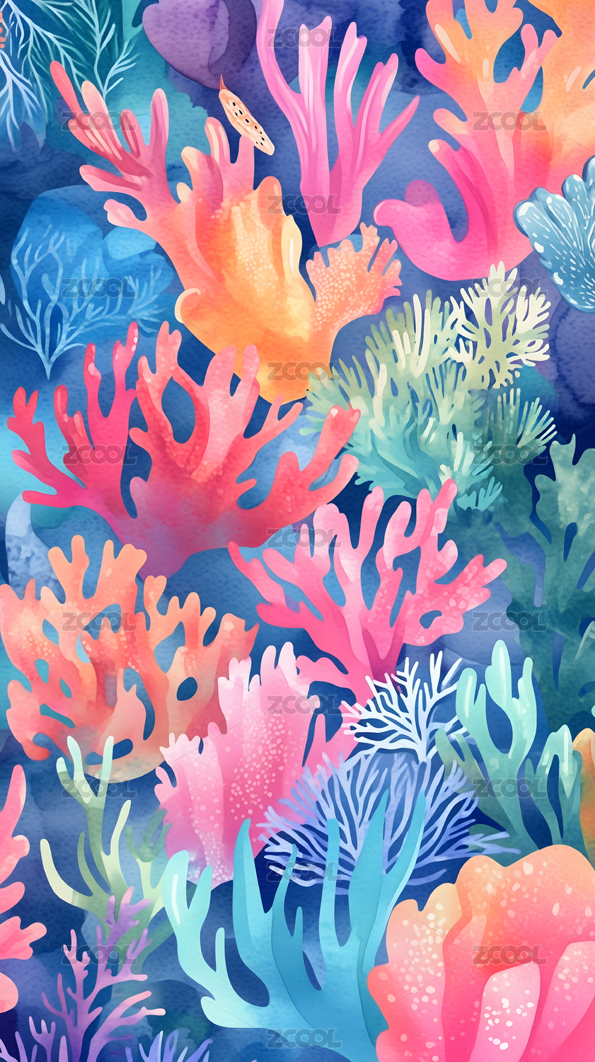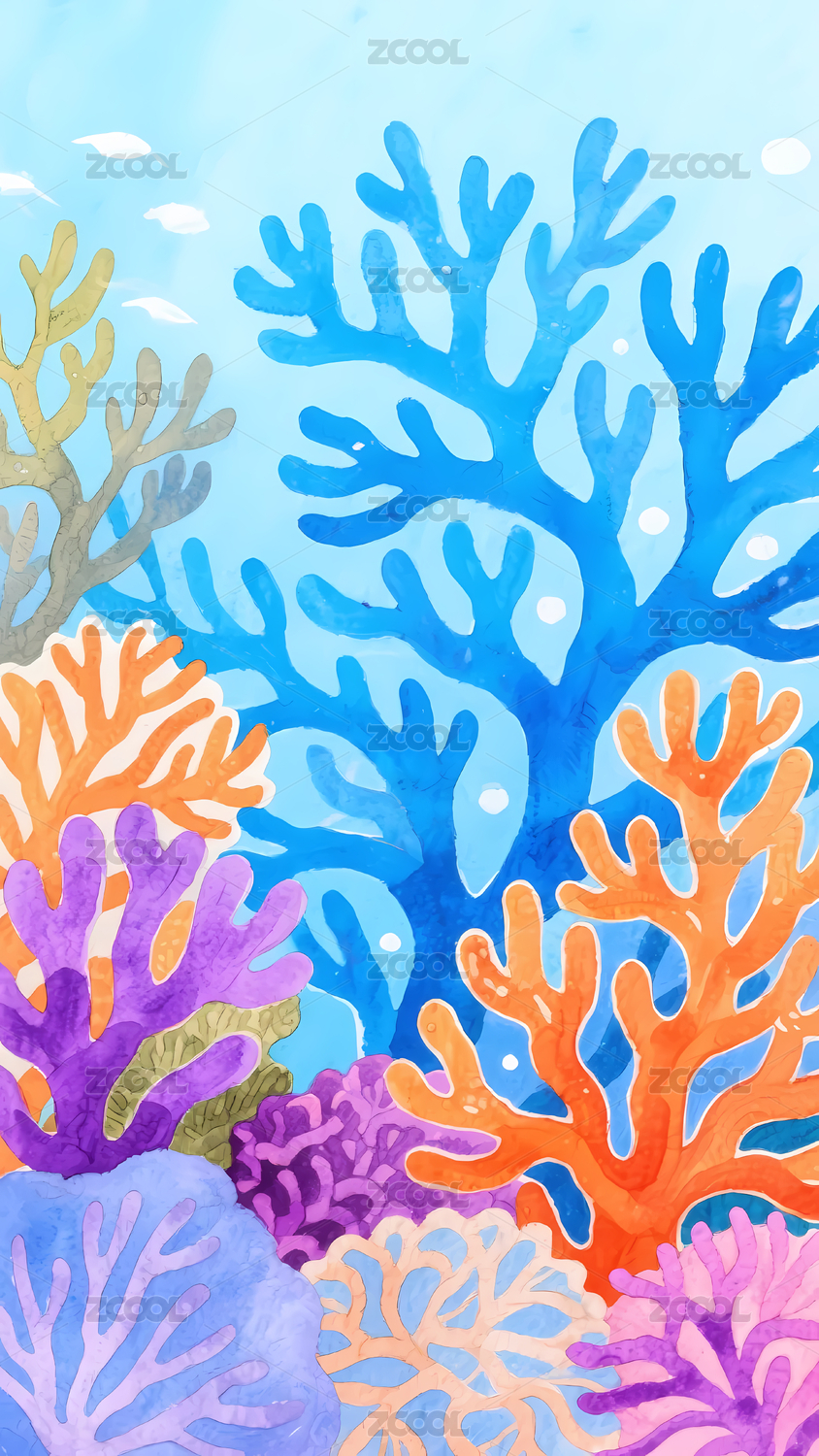 印刷复古清新明亮海底的彩色珊瑚插画绘画