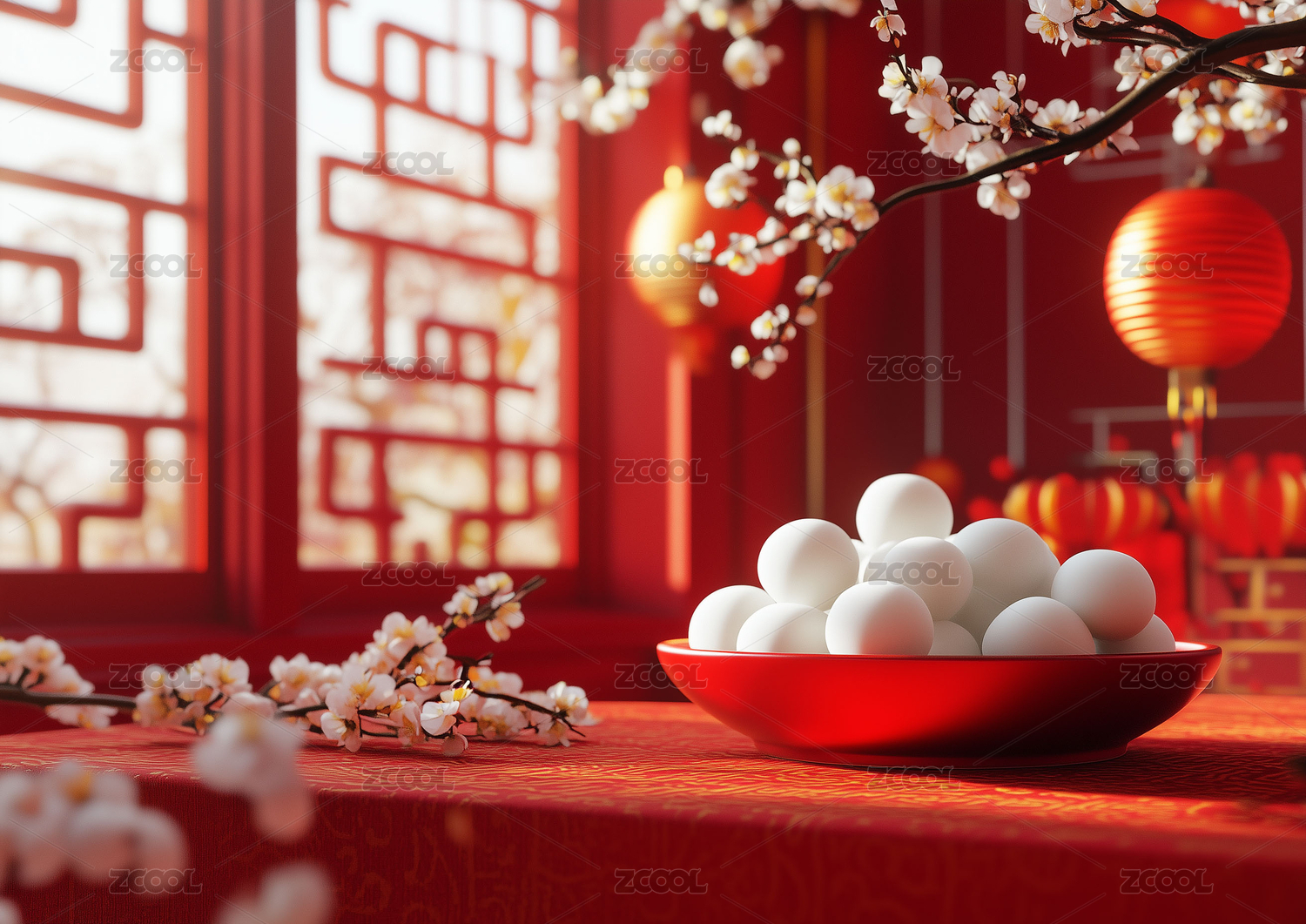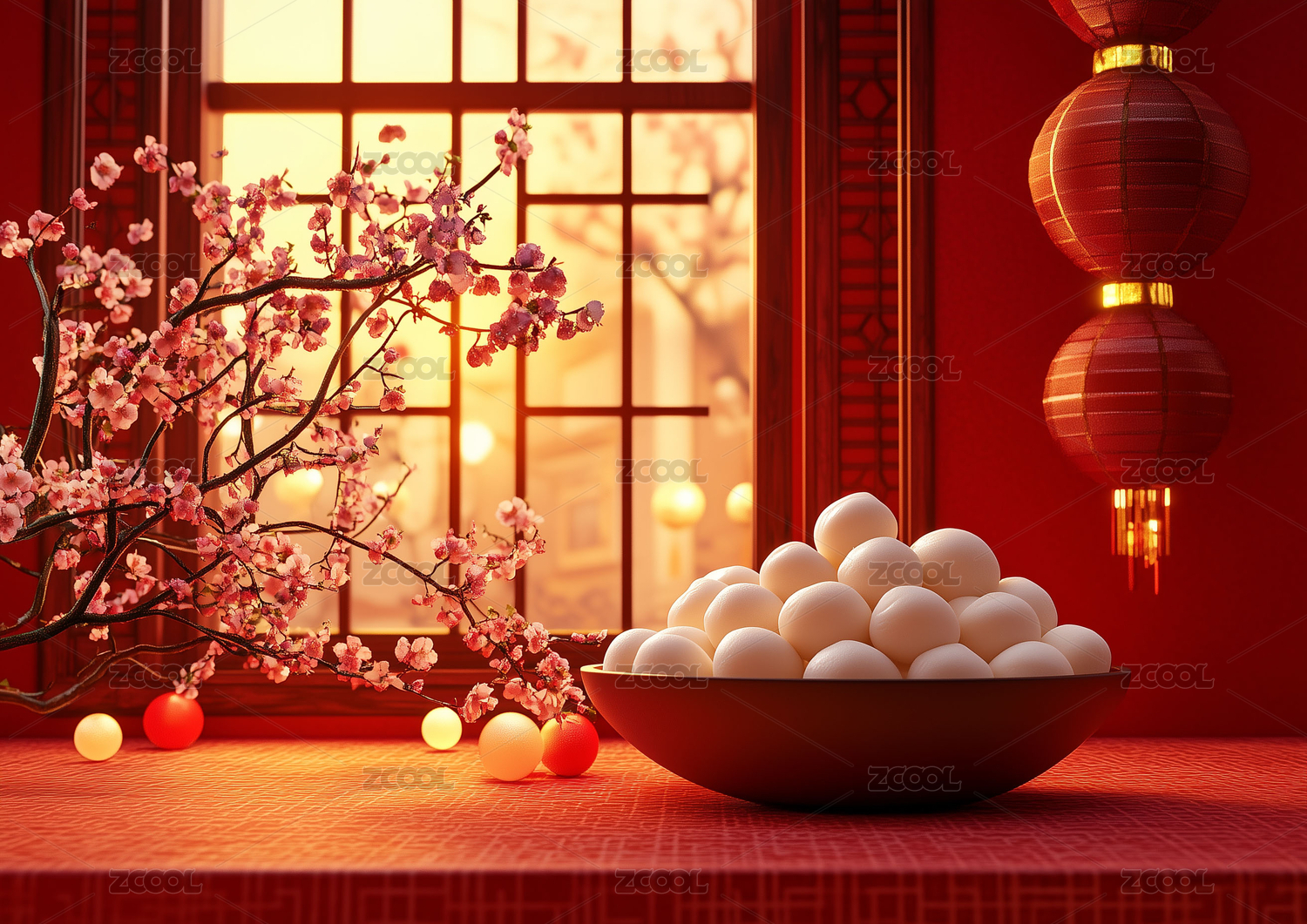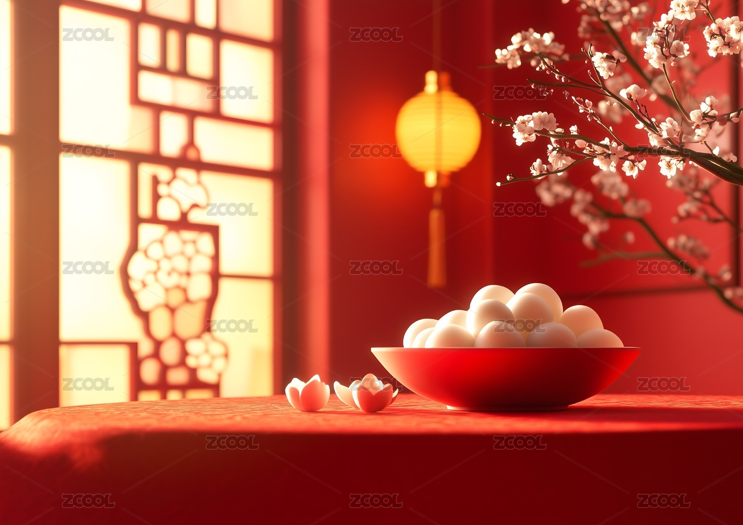 新春元宵佳节素材,喜庆背景上一碗汤圆