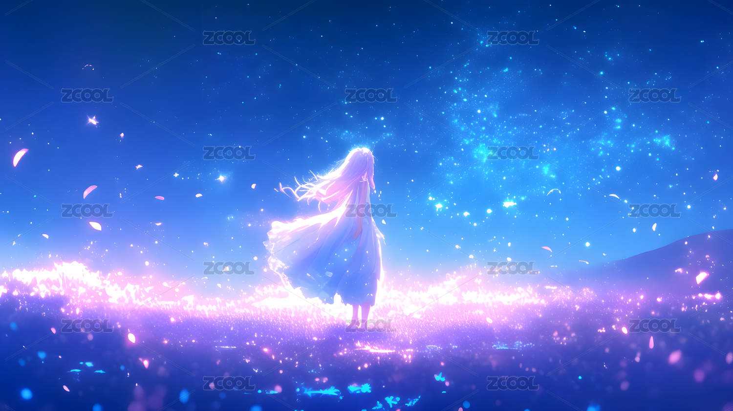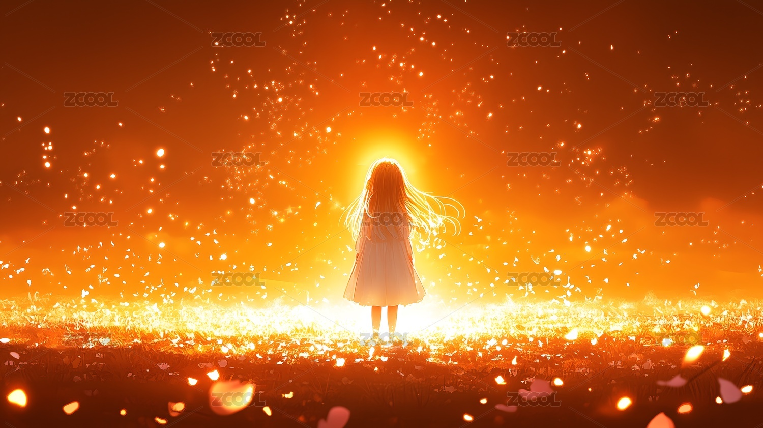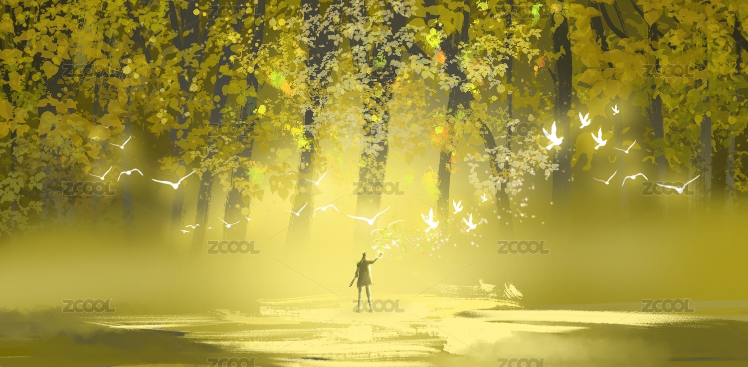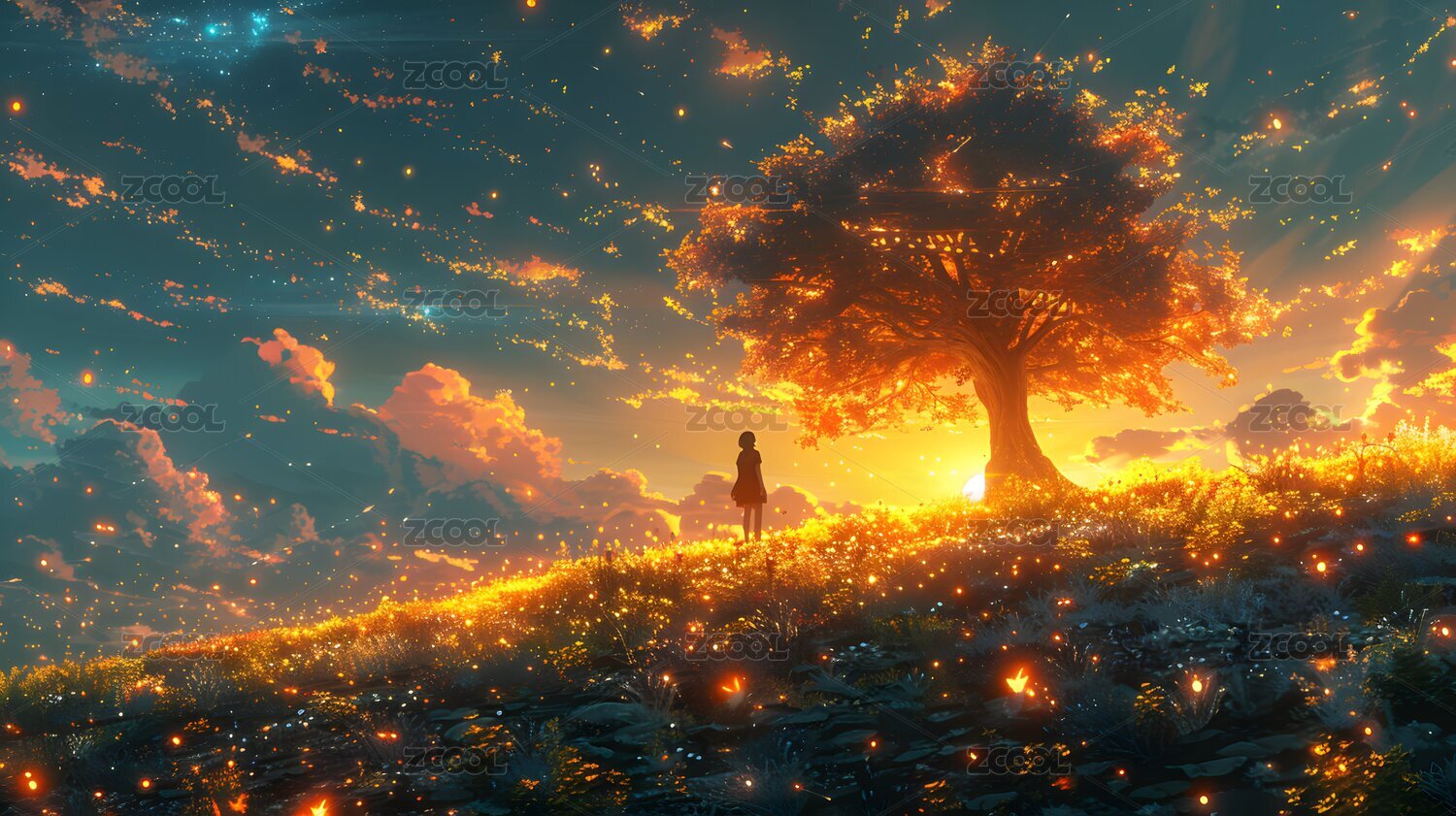 新海诚风格植物大树阳光夕阳日漫卡通插画
