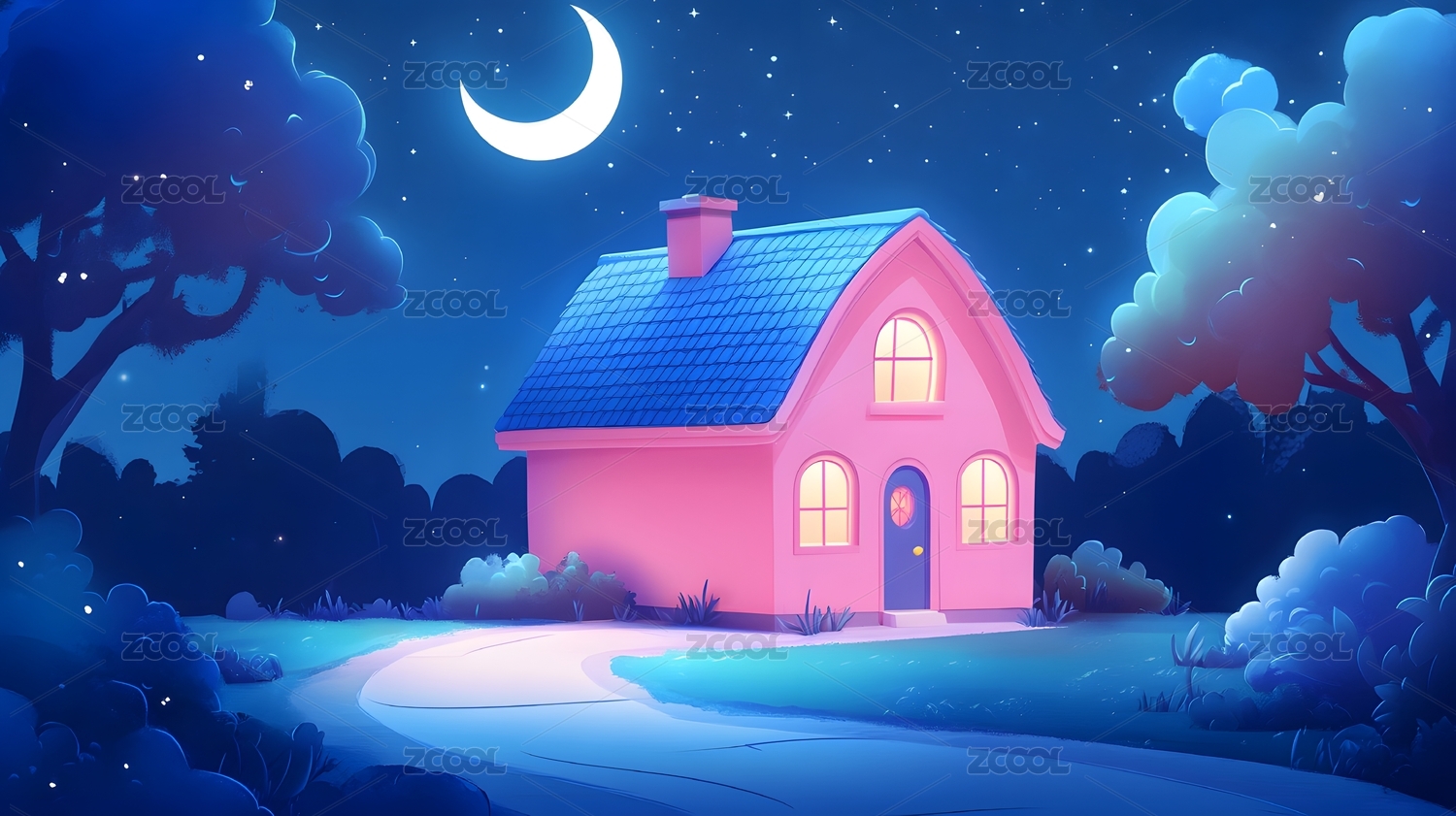 万圣节恐怖房屋夜晚城堡复古装饰节日插画