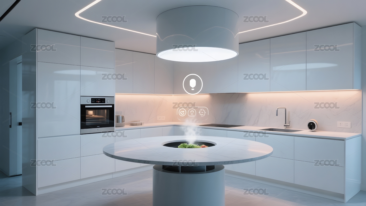 现代智能厨房,白色橱柜搭配圆形中岛餐桌