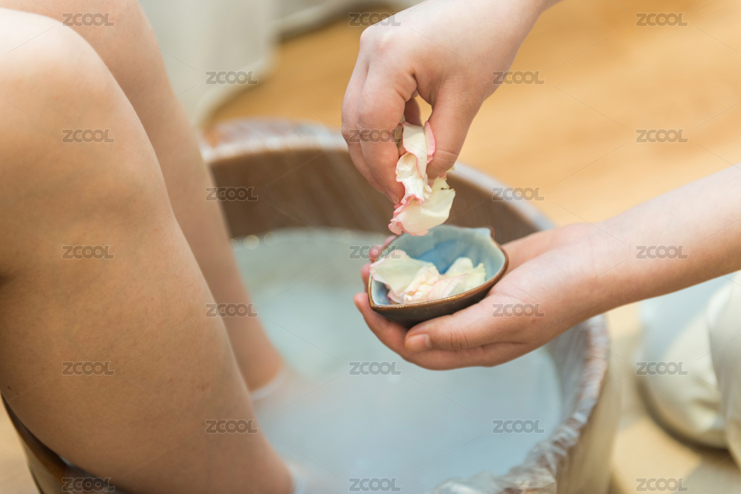 为泡脚的木桶中添加玫瑰花瓣